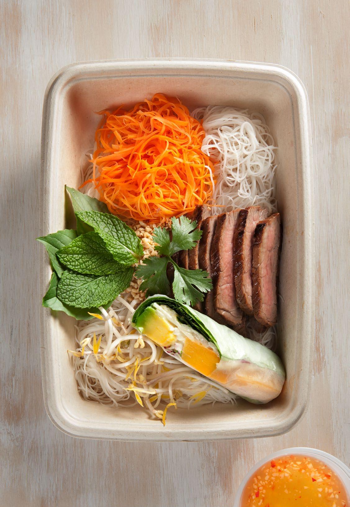 Lomo de res a la parrilla marinado con nam-pla y aceite de ajonjolí con pasta vermicelli, maní y un spring roll de vegetales servido con salsa vietnamita con nam-pla. $52.900 Portobello.