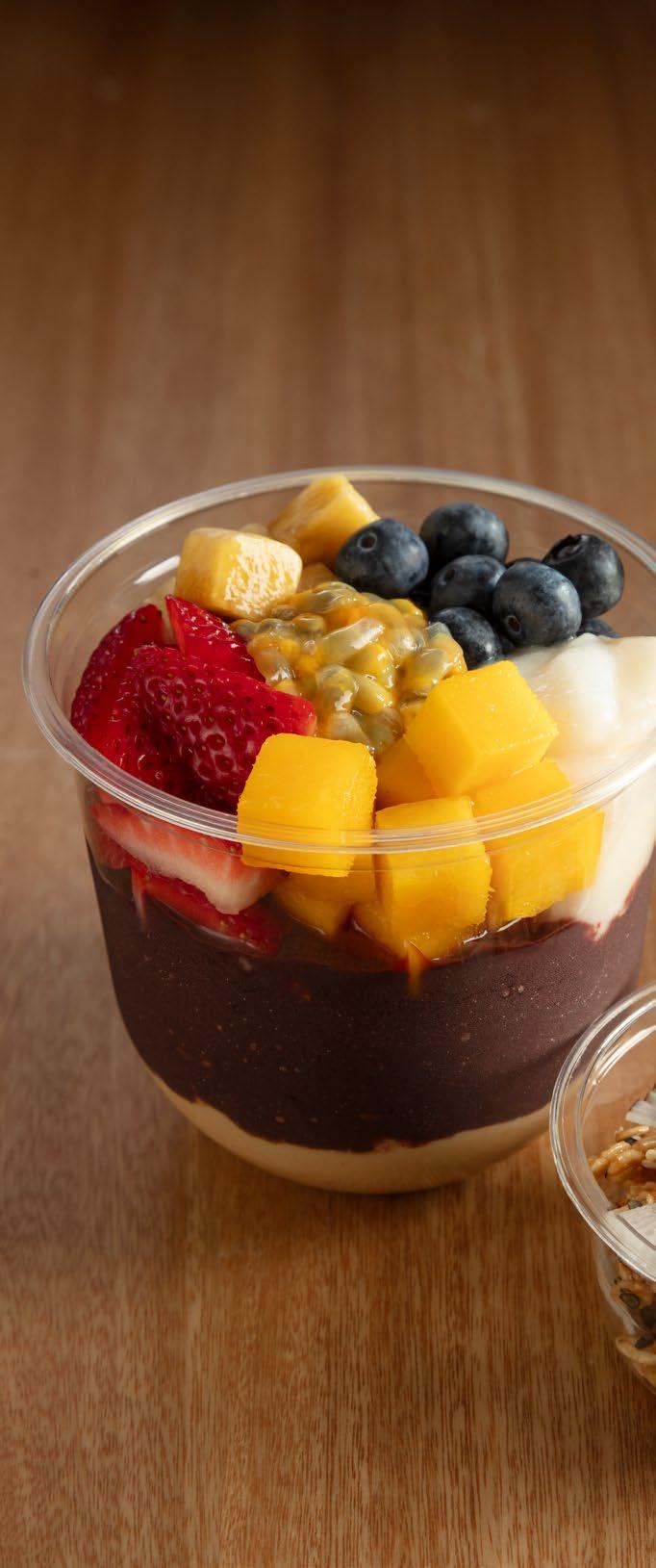 A base de yogurt con mango y miel, mezcla de quinuas pop, coco natural, hojuelas de coco caramelizadas, nibs de cacao y marañón. $16.900