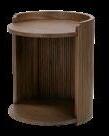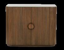 Danielle Chiprut envisioned her My Rowe Design as a richly layered living room that feels both romantic and deeply personal, a “dreamy, cozy jewel box” where texture, color and light come together to create an immersive atmosphere. An earthy color story of blush, burnished brass and natural wood tones creates a space that feels moody yet soft, eclectic and full of soul. Cozy throws and brass lighting add warmth, while a Kindred Cabinet brings architectural interest with vertically reeded detailing, a subtle nod to the fluted wood panels of the fireplace wall.