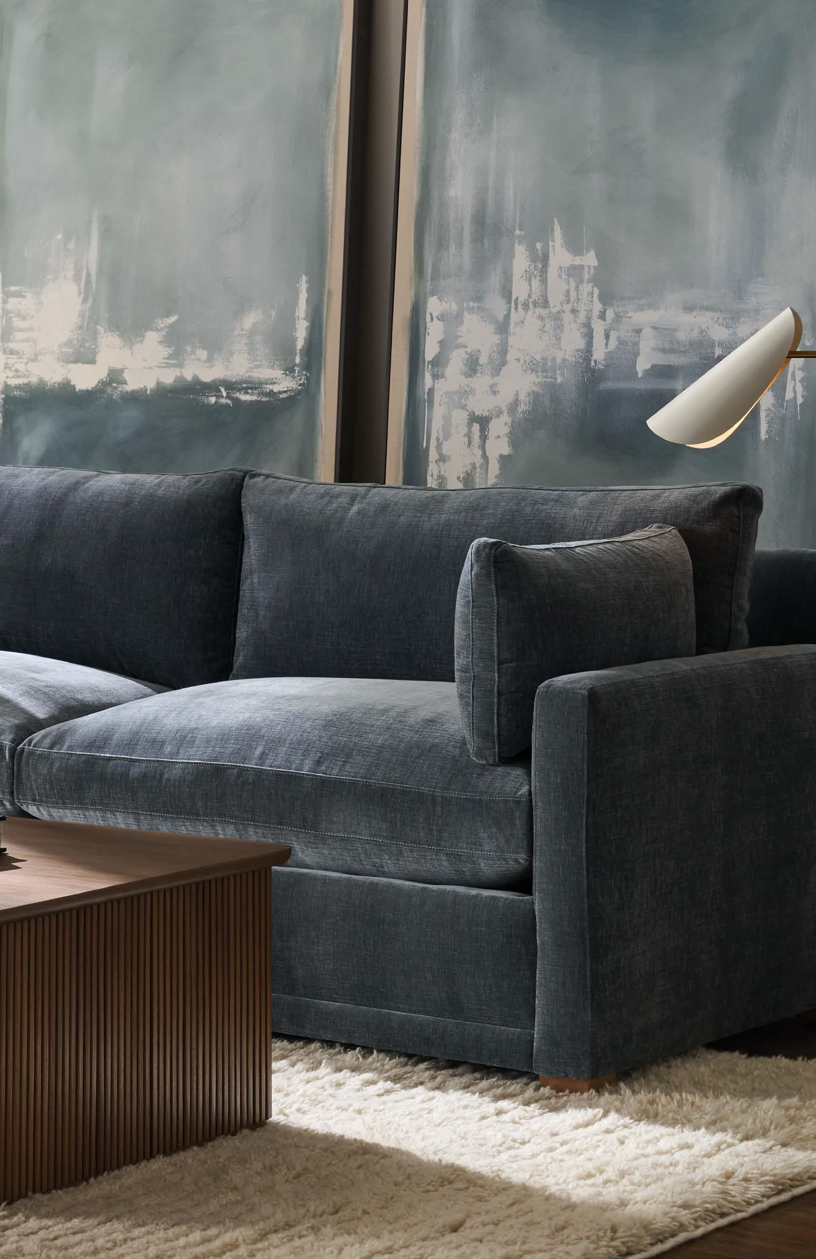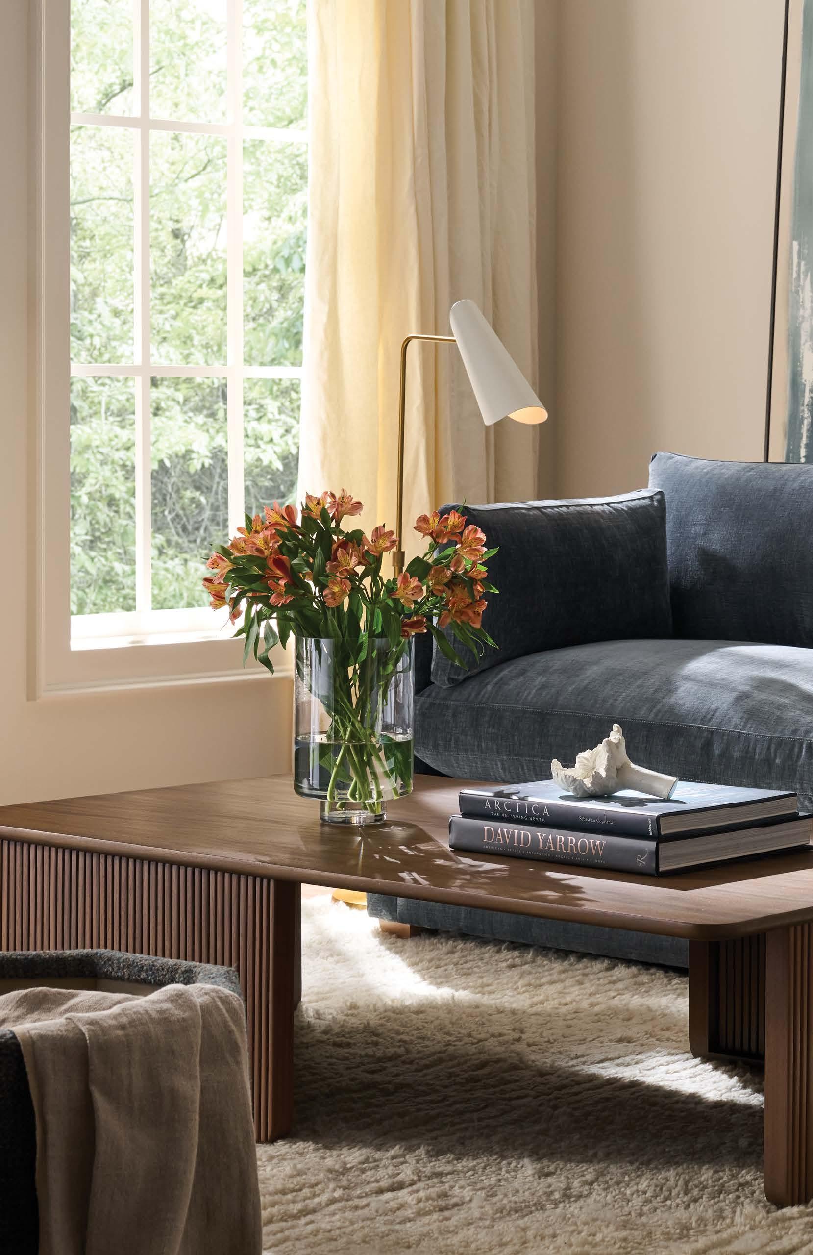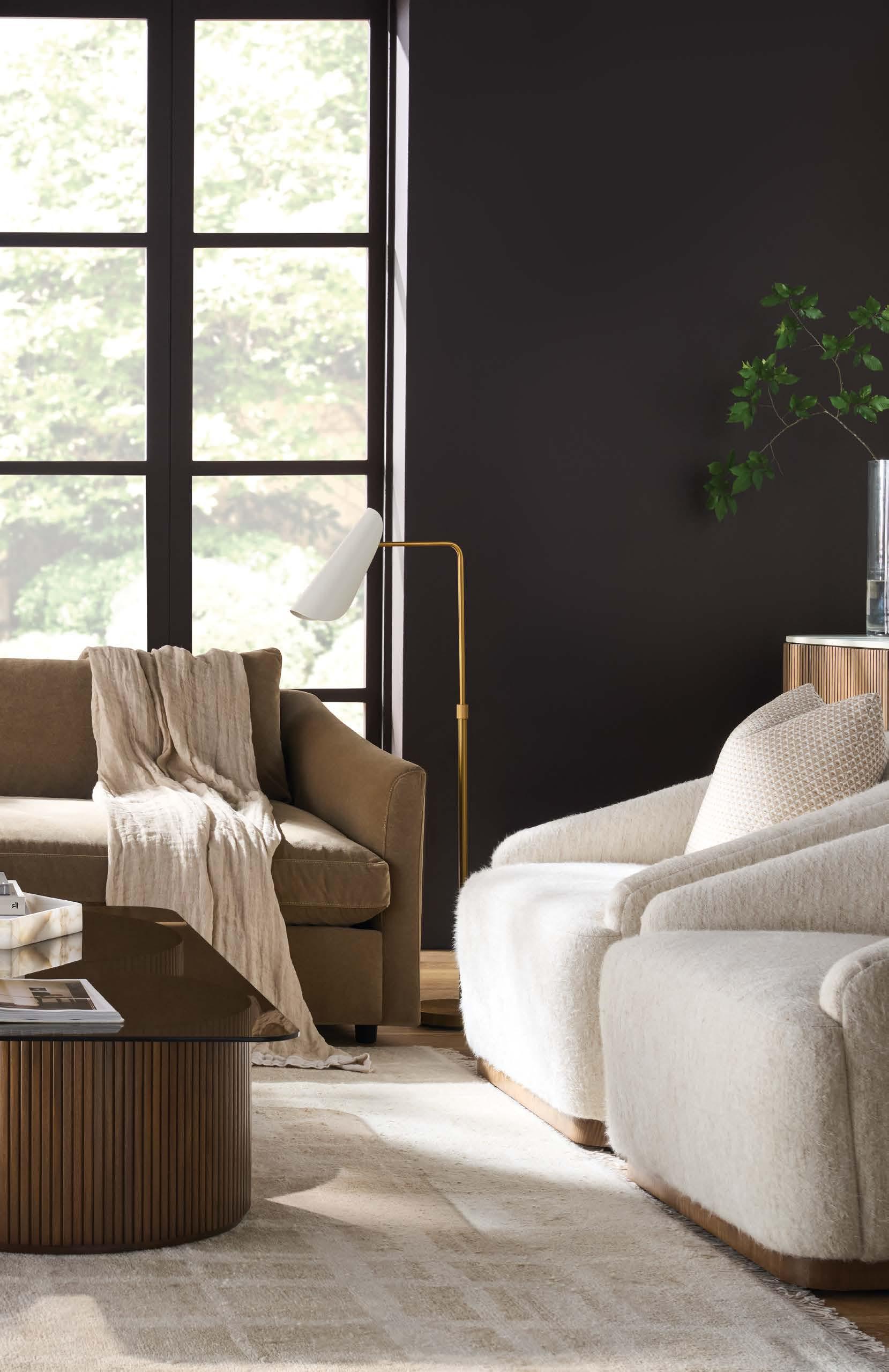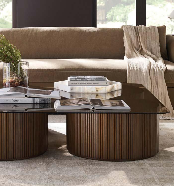 At the heart of the space sits the Kindred Square Cocktail Table, a favorite of the designer and the conceptual anchor for the entire room. Its substantial cylindrical bases—wrapped in meticulously crafted reeded detailing and crowned with smoked glass—strike a balance between masculine structure and feminine curves. The table serves as a social gathering point, surrounded by pairs of Atticus and Bernie Chairs and a generously scaled 110” Adler Sofa that invite reclining and long conversations that linger into the night.