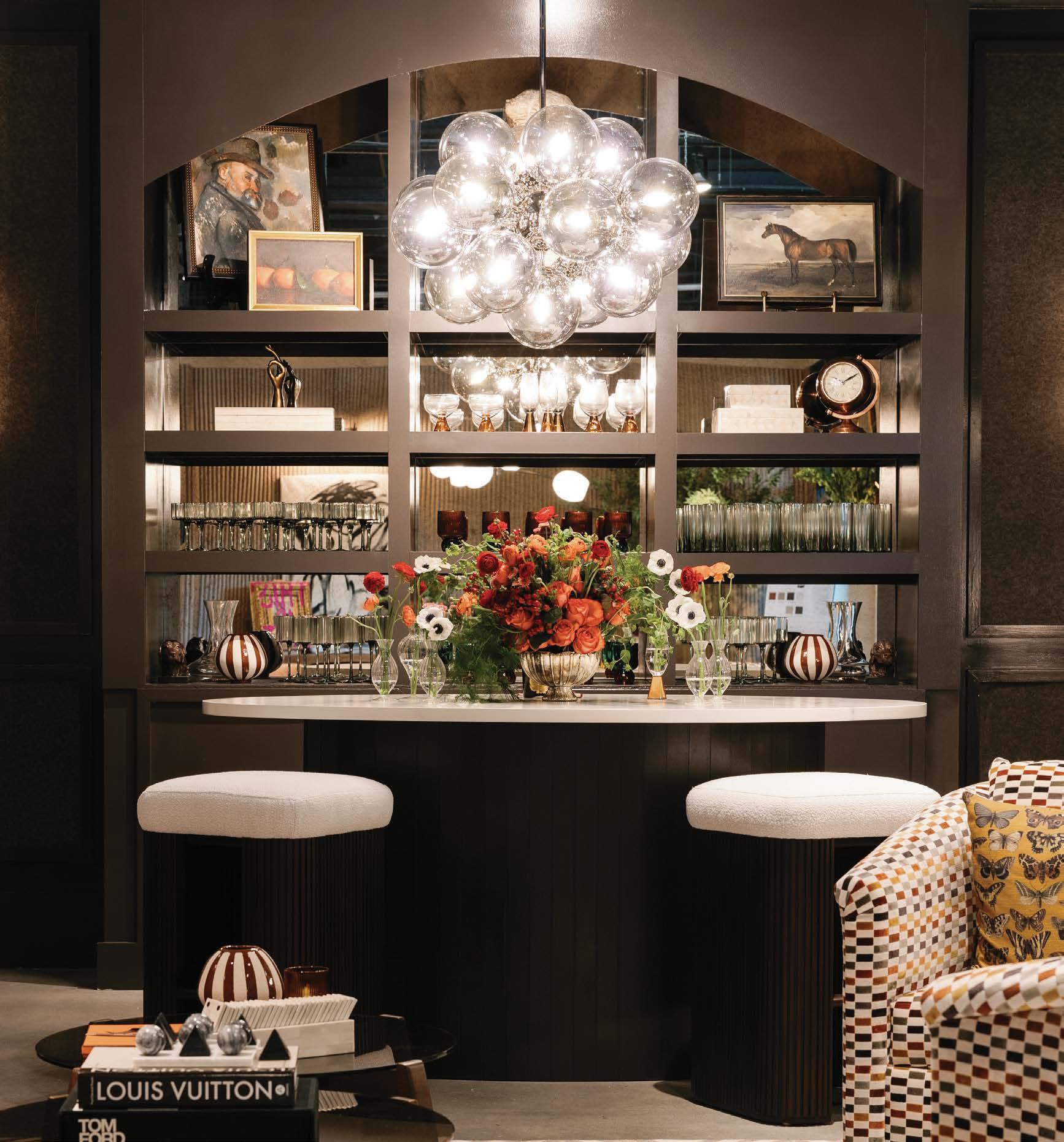 Inspired by the seductive, cinematic glamour of late-1970s interiors, Lisa Furtado’s My Rowe Design space is a study in bold beauty and modern mood-making. Velvet upholstery and expressive pattern unfold in a palette of dusty lavender and rich cranberry, creating a room that feels unapologetically dramatic, yet exquisitely refined. Even before guests step inside, it is easy to imagine the magnetic feminine presence Lisa envisioned as her inspiration: “the kind of woman who walks quietly and slowly into a room, but draws all the attention. She loves bold and artful surroundings, not to impress, but because she knows that design and good lighting can create an experience.” That vision comes fully alive in this alluring setting, where pattern and color combine to create an experience that’s moody, glamorous, and just a bit rebellious.