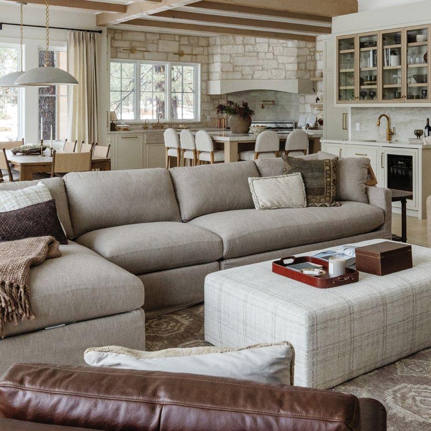 “The Bristol Sofa is a deeper, lounge-friendly silhouette, perfect for the kids in this family home. Placed in the great room, it anchors the primary gathering space where the family relaxes and entertains. The Cleo Ottomans were chosen for their playful yet elevated striped pattern, complementing the room’s modern farmhouse aesthetic.”