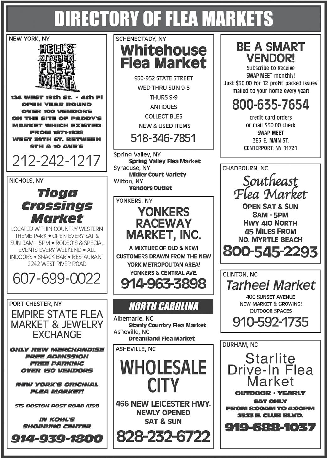 ADVERTISE YOUR PRODUCTS TO FLEA MARKET VENDORS NATIONWIDE! We Circulate in All 50 States... National Circulation in One Magazine See Our Rates on Page 4 • 631-754-5000 National Magazine for Flea Market VendorsVOL 32 NO. 12OCTOBER 2022 IN OUR 32ND YEAR! Swap Meet FREE ONLINE DIRECTORY POWERED BYwww.SwapMeetMag.com See Our Ad on Page 08 • www.PattersCollectibles.com Your Source for All Collectibles Novelties • Apparel LICENSED SPORTS TEAM ITEMS Fast Shipping • Great Prices 1-412-916-2456 All Treats... No Tricks 2 Great Locations: 80 Pearl Street & 29 W. 25th Street • www.BrooklynFlea.com See Our Ad on Page 12 • www.WholesaleCentral.com/JRPalacios Be A CowBoy yeAr ‘round with JR PALACIOS Full Line of Western Products Hats • Buckles • Belts Open Saturday & Sunday 1-956-421-2864 Operating Since 2008 Jewelry Art Clothing Food Furniture