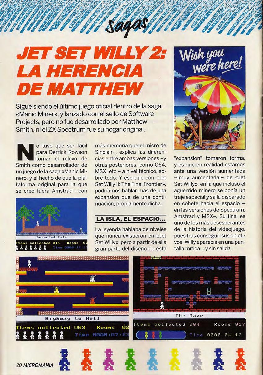 "expansión" tomaron forma, y es que·en realidad estamos ante una versión aumentada -im uy au mentada !- de «Jet Set Willy» , en la que incluso el aguerrido m in ero se ponía un traje espacial y salía disparado en co h ete hacia el espacioen las vers iones de Spectrum, Amstrad y MSX-. Su final es uno de los más desesperantes de la historia del videojuego, pues tras consegu ir su s objeti · vos, W illy aparecía en un a pa n· talla mítica ... y sin salida.