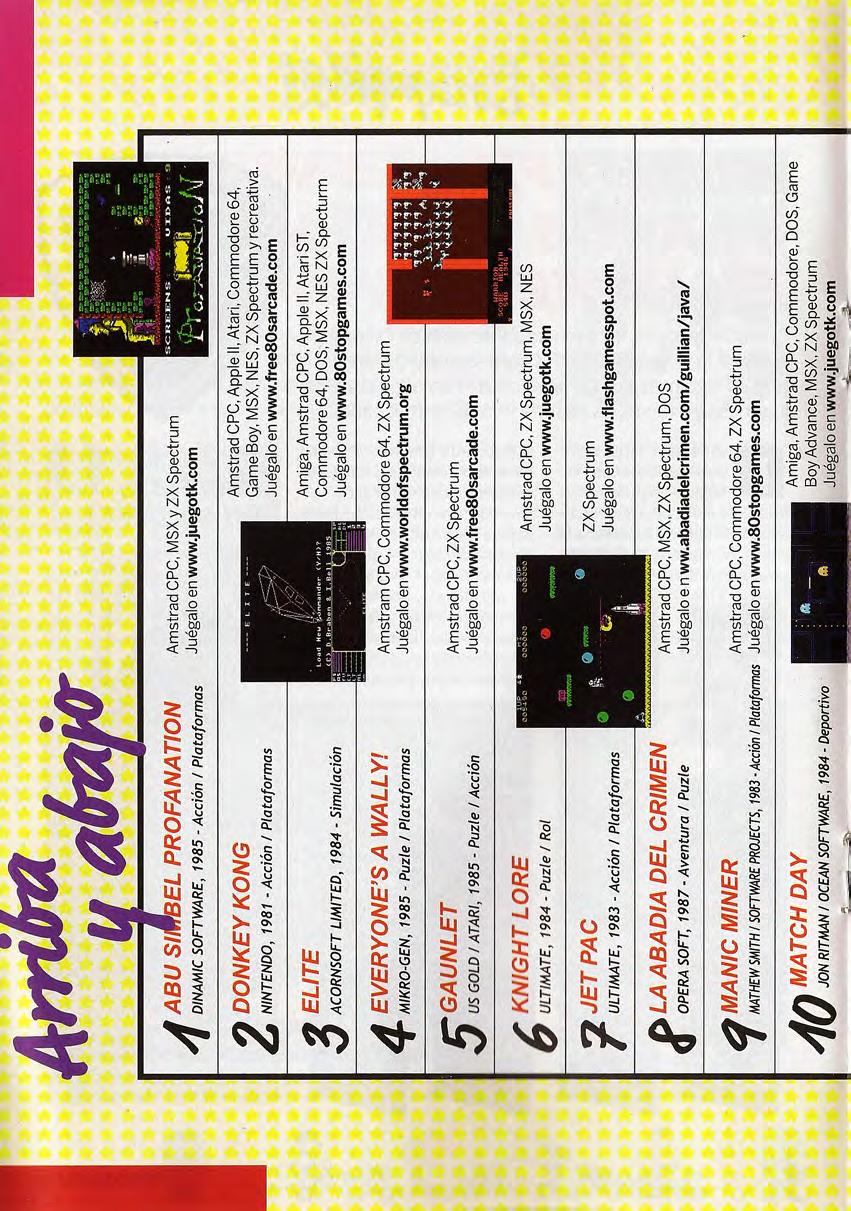 Las listas siempre so n polémicas. Y ésta, lógicamente. también lo va a ser. Y es que elegir 10 j u egos co m o los más destacados de l os años 80 para Spectr um. teniendo en cuenta los casi 25.000 -contabilizadosque salieron para la máqui· na de Sinclair. no es cualquier cosa. Por eso. este Top 10 simplemente es el nuestro. el de Micromanía. Y sí. nos dejamos muchos, muchísimos juegos qu e d i sfr u tamos y añ ora mos . Todos estos y más l os pu edes e n contrar en fo r ma de ROM o en versión JAVA, en casi todas las páginas listadas a Ja izquierda: