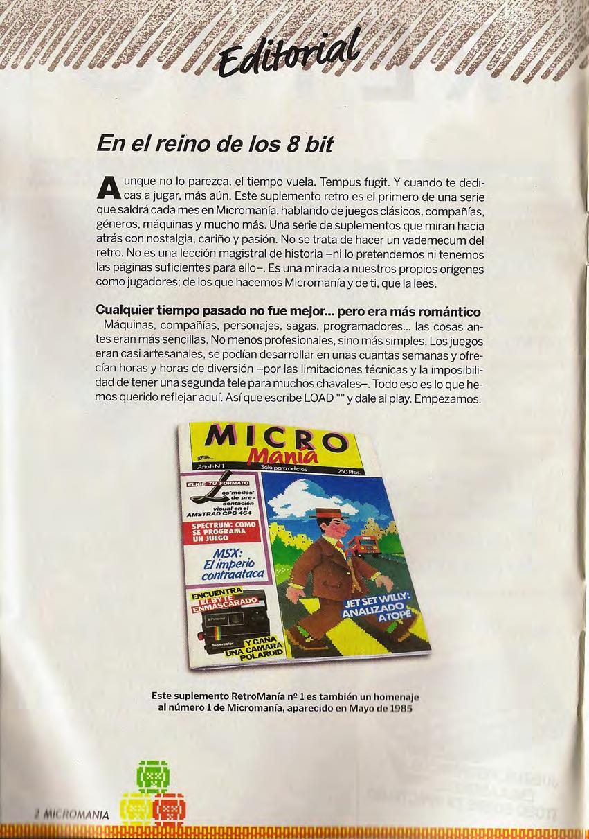 Aunque no lo parezca. el tiempo vuela. Tempus fugit. Y cuando te dedicas a jugar. más aú n Este suplemento retro es el primero de una serie que saldrá cada mes en Micromanra, hablando d e juegos clásicos, compañía s géneros, máqui nas y m ucho m ás. Un a ser ie d e suplemen tos que mir an haci a atrás c on nosta lgia. ca ri ño y pa sión. N o se trat a d e hac er un vade m ecu m del retro . N o es una lección m agis tral de hi storia - n i lo pretendemos n i te nemos las pág i nas suficientes para ello-. Es una mirada a nuestros propios orígenes como jugadores: de los que hacemos Micromanía y de ti, que la lees.