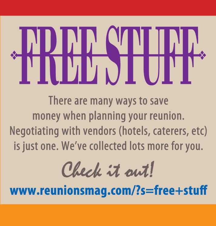 Scrapbook looks a tad thin this time but its contents make up for it. There are extended discussions of freebies for reunions and podcasts about specific reunion planning details. There’s nothing reunion planners like more than freebies so we’ve collecting some and eagerly accept more anytime. Podcasts are all about 10 minutes long so you’ll not be spending an inordinate amount of time … enough to get a good sense of the topic. You’ll want to explore both freebies and podcasts.