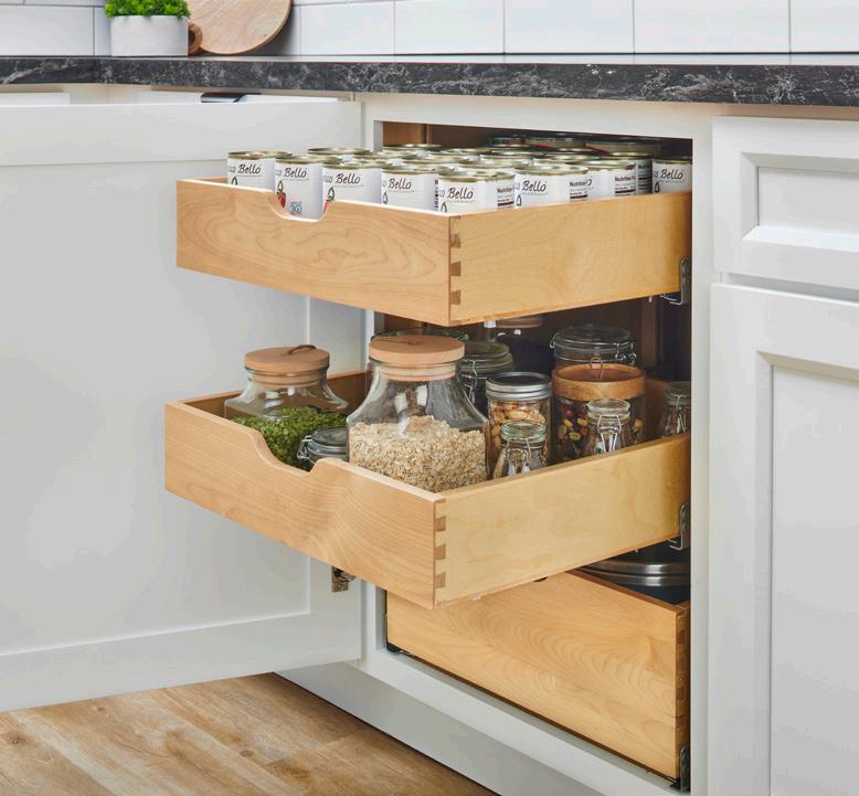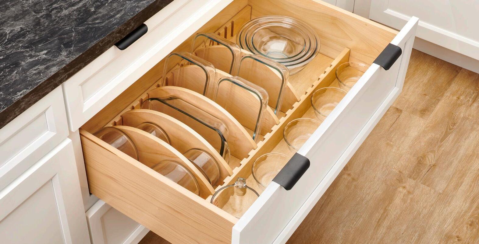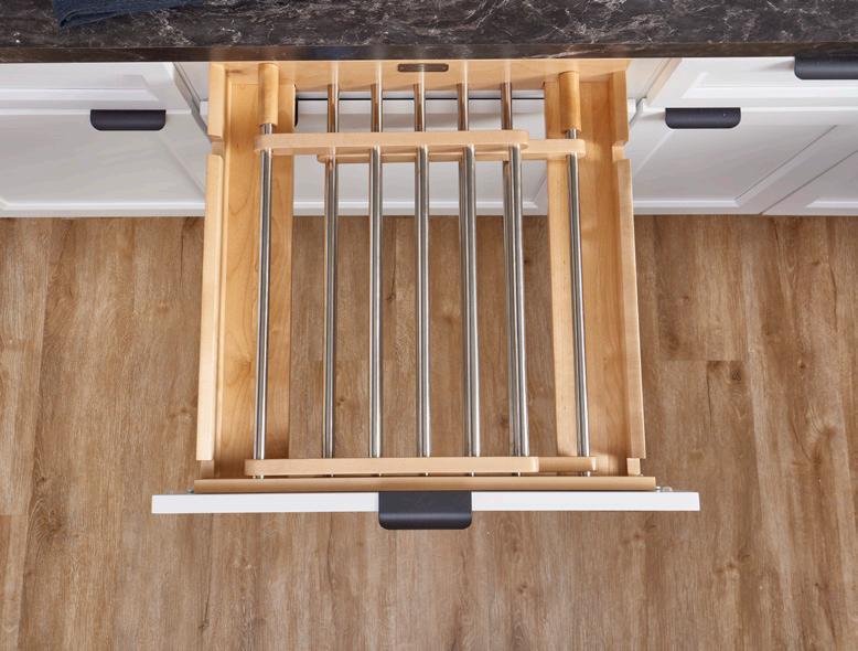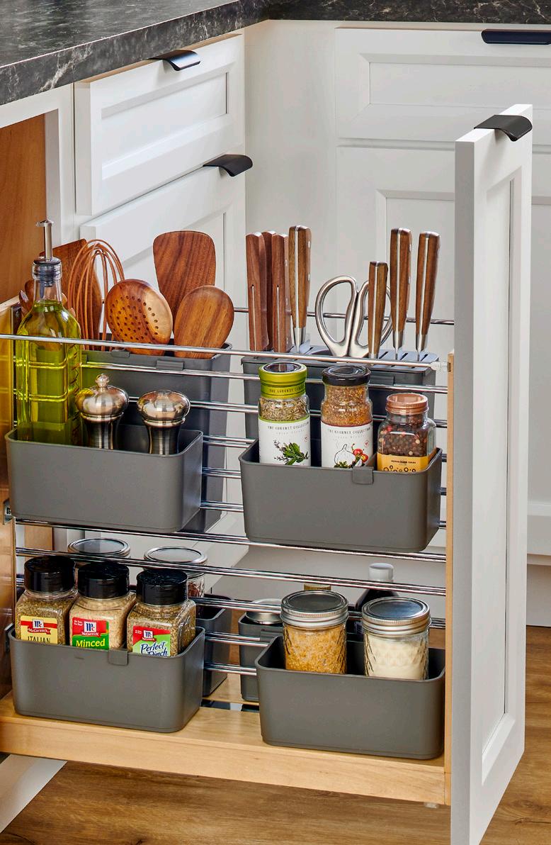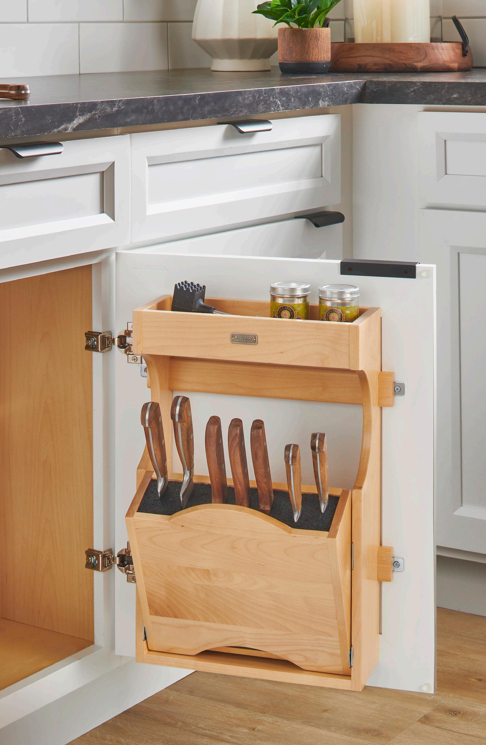Knives, cooking utensils, spices and more…. The 444 Series Wood Base Cabinet Modular Pullout Organizer from Rev-A-Shelf® can store it all! Includes removable, washable bins that can be used in any configuration.
