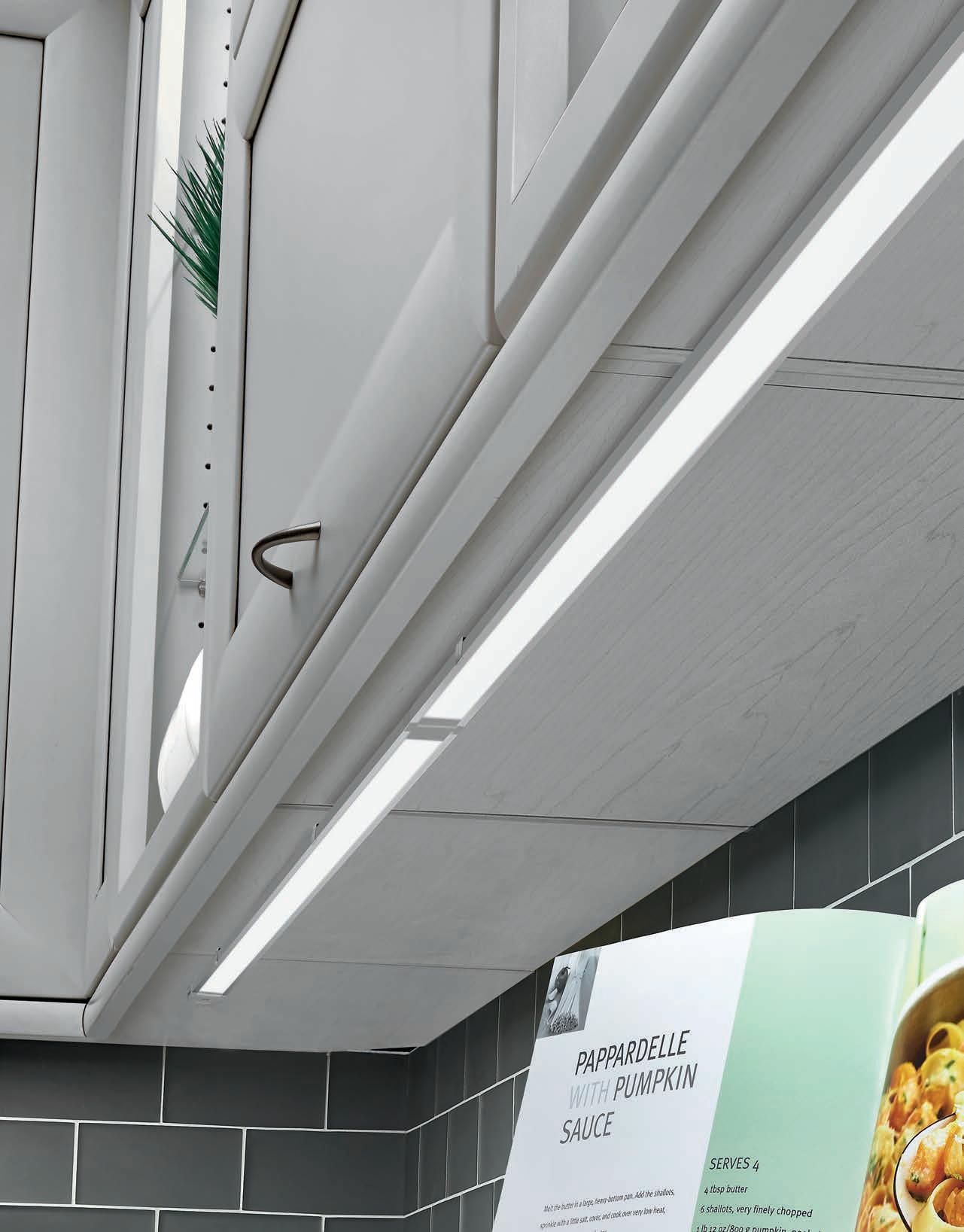 Lumen is the measure of visible light output emitted from a fixture. For under cabinet lighting, where the goal is to illuminate a workspace to perform specific tasks, the brighter, the better. For soffit, toe kick or other accent lighting, a moderate output is better.