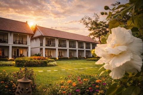 The resort occupies expansive grounds filled with tropical gardens, lotus ponds and colonial era architecture. From its elevated position above the river, panoramic views extend across the water to surrounding mountains and forests. The setting feels serene and contemplative, allowing guests to step away from modern pace and enter a more reflective rhythm guided by nature and tradition.