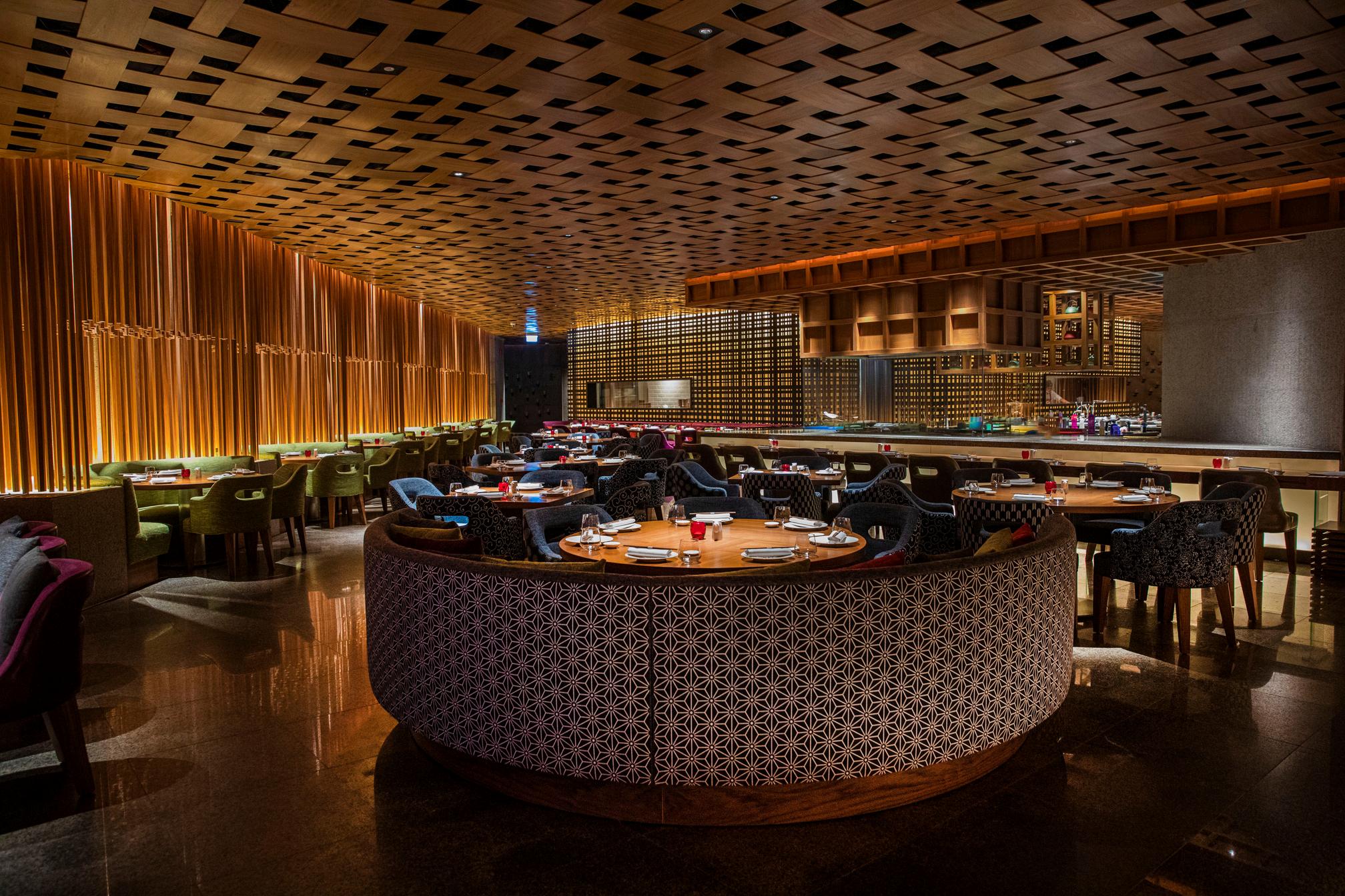The design plays an important role in shaping the experience A softly lit interior combines deep blue tones with warm gold accents, creating an environment that feels intimate while remaining vibrant. Seating is arranged around an open kitchen, where chefs work with precision at the robata grill and sushi counter Guests can watch dishes take shape in real time, adding a sense of theatre to the evening and strengthening the connection between preparation and presentation