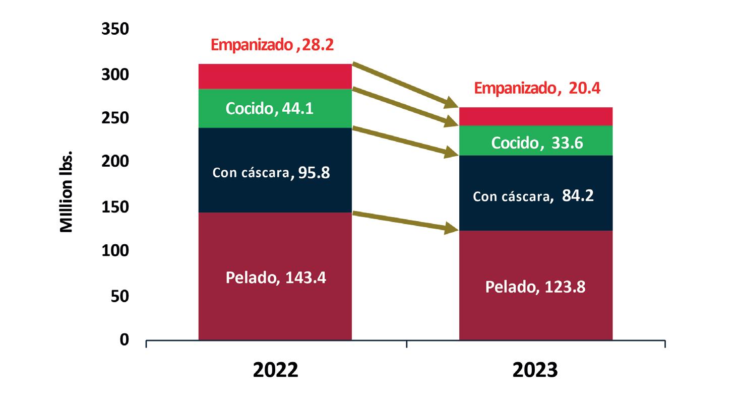 Por tipo de producto, se observó nuevamente un crecimiento negativo en todas las categorías: camarón con cáscara (-20.3%), pelado (-11.7%), cocido (-35.5%) y empanizado (-33.0%).