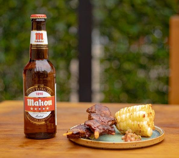 notas a frutas y fácil de tomar. Esa frescura resultó un contraste interesante para el plato. Ernesto decidió no marinarlos demasiado, por el contrario, desarrolló ligeros sabores de la panca y el sillao. Los aromas bajaron la potencia y le fue muy bien. No obstante, obtuvo mejores resultados en el segundo maridaje. Juntó el arroz con pollo al estilo limeño con Mahou Clásica. Una cerveza sabrosa, refrescante, ligeramente afrutada, con buen equilibrio entre alcohol y acidez.