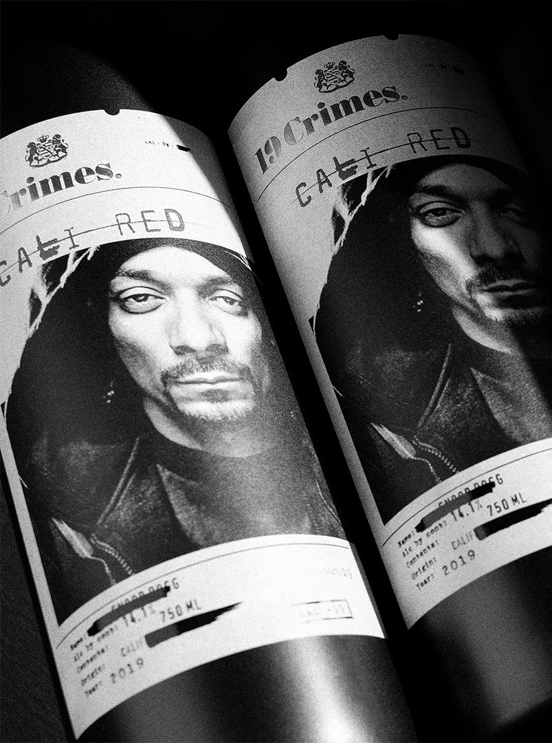 Para los apasionados por los vinos con historia, están las etiquetas de 19 Crimes. Cada una presenta la ficha policial de un personaje histórico singular, quien está allí por haber cometido algún delito presentado en la lista. Gracias a la tecnología, podemos apreciarlos en realidad aumentada a través de la aplicación Living Wine Labels. Sin embargo, la bodega dio un paso hacia adelante en cuanto a innovación tras colaborar con el famoso cantante y rapero Snoop Dogg. 19 Crimes es desafiante por naturaleza, audaz en ca-