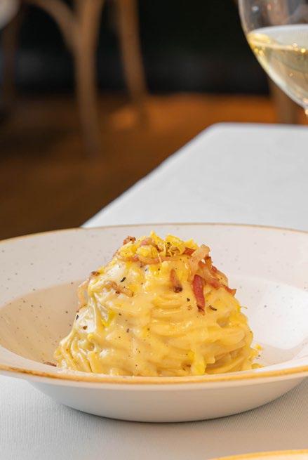 Entre sus pastas caseras destaca la Carbonara, la cual se mantiene fiel a la receta romana, con el uso del verdadero guanciale y yema curada; un plato que hace alarde de su simplicidad para resaltar la calidad de cada ingrediente. Sin embargo, platos como