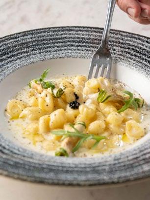 el Gnocchi al Perlage di Tartufo sorprenden con una combinación de crema de grana padano y caviar de trufa negra, que eleva esta pasta a un nivel de lujo culinario.
