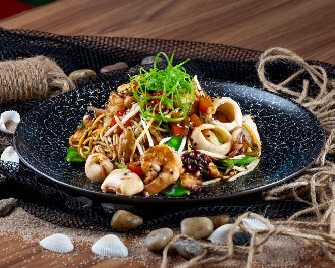 arriba. Asimismo, tienen cuatro tipos de causas. La de langostinos es mi favorita. También está la de pulpa de cangrejo, la acevichada y la escabechada de bonito. En otro apartado están los platos calientes, donde encontrarás arroz con conchas negras, el clásico arroz con mariscos y el chaufa que, respetando las raíces de Ángel, se elabora no tan graneado. De aquí probé el Tallarín Saltado Llauca con langostinos, pulpo, conchas y calamar. Reco-