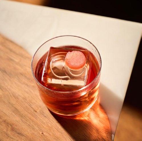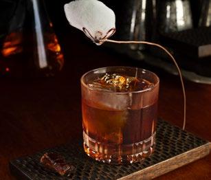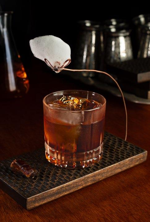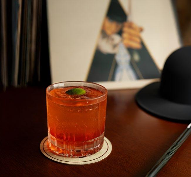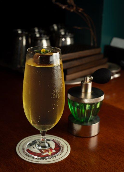 agua hirviendo. Dice la leyenda que el árbol sopló, cayeron las hojas y el agua tomó color. Así se dio origen al té. El primer cóctel de esta experiencia va en honor a él. Por cierto, le dije a Alejandro que este es el más complejo y mejor logrado de su carta de autor. Shen Nong lleva gin infusionado en té negro, gin London Dry, vermouth en té de jazmín, matacuy y San Antonio. Una bebida totalmente disruptiva, la cual rompe la pared que acostumbramos. Continuamos con Koroviev. Este es un personaje que, en palabras de Alejandro, siempre es elegante, sigiloso, astuto. Digamos que recrea la imagen del lugar, un speakeasy de los pocos que existen en Lima. Para ingresar siempre habrá un código, aunque eso es material secreto. Volviendo al cóctel, le hace oda al clásico negroni. Se compone de gin al ajonjolí, vermouth rosso, bitter y manzana verde.
