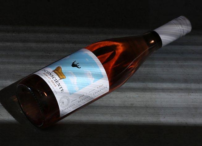 sin interferencias. Por la naturaleza porosa del material, ayuda a la microoxigenación natural sin aportar taninos ni aromas. Inconsciente busca compartir el carácter del Valle de Uco en su estado más puro. Por ello, el resultado son vinos más ligeros, redondos en boca, donde se presenta el varietal bien expresivo, con mucha fruta y frescura. Merlot Rosé nace en viñedos orgánicos que cosechan de forma manual y prensan de forma inmediata, buscando el mínimo contacto entre pieles y mosto. De color rosa brillante, en nariz se presentan aromas a frutas rojas como frutilla y cereza, en boca la acidez marca el recorrido en el tiempo, con un regusto jugoso que hace recordar a ciruelas.