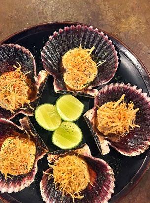 el punto de cocción perfecto del pulpo es un reto, sin embargo, en esta ocasión lo consiguieron. Además de la crema de olivo, el plato tiene varios ingredientes que aportan suavidad como la palta, las alcaparras acidez y el tocino la nota crujiente. Continuamos con las conchas acevichadas a la parrilla, las cuales reflejan el uso del fuego. Siempre he creído que las conchas son un ingrediente noble, capaz de brillar en cualquier preparación. Aquí, la acidez del ceviche, el sutil ahumado de la parrilla y el toque crujiente de la masa frita crearon una combinación irresistible, transformando las conchas en un verdadero manjar.