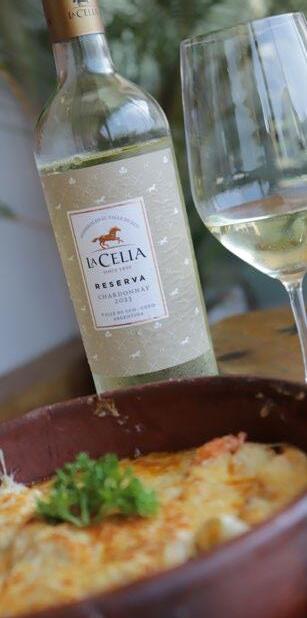 ello, el chardonnay de La Celia, que llega desde el Valle del Uco, era el ideal para los bemoles de pasta. Ya el chardonnay nos da robustez en boca, como todos sabemos, pero adicionalmente a este perfil, el 95% de este vino es criado sobre sus borras finas durante 4 meses en tanques de acero inoxidable, y el 5% restante se reserva en roble francés. Con esto logramos una tenacidad franca para calmar las ansias de los quesos y los mariscos. Aquí fue un maridaje de control, pues en boca tanto el vino como el plato se medían en su intensidad.