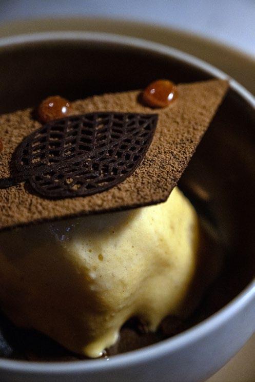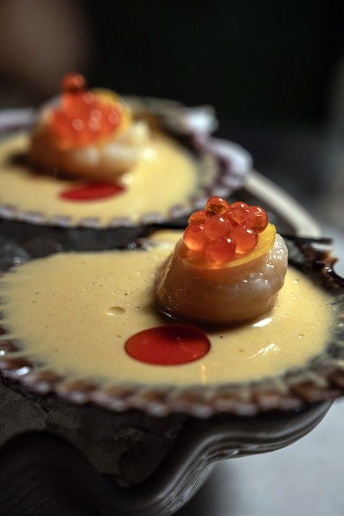 nadas con tapioca y un mousse de bastón del emperador. Esta es una flor que se encuentra en Asia y en la Amazonía peruana, además es sumamente aromática. El segundo tiempo consistió en una tosta crocante de carbón activado rellena de Pulpo y bonito en muchame con ponzu de limón mandarino con hierbas aromáticas, donde el sabor que predomina es el de los brotes de oxalis, eneldo y cilantro macho que, desde la presentación, ya nos decía que era único. Nos recomendaron comerlo con la mano y de un solo bocado para apreciar la explosión de sabores y texturas.