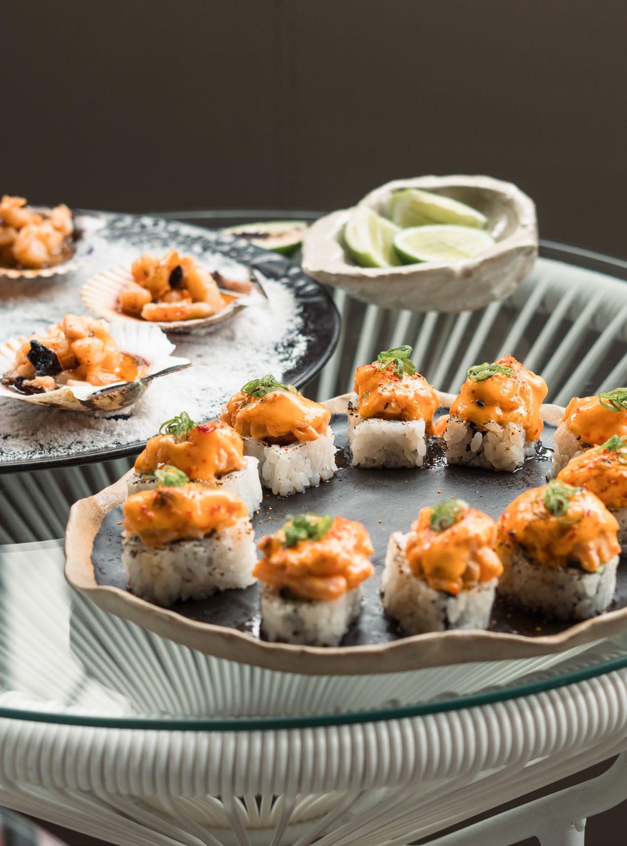 Entre los platos más celebrados está el Tiradito Hana, finas láminas de pesca del día que llegan acompañadas por una emulsión de conchas, gotas de camote y una chalaquita especial. Cada elemento conserva su carácter, pero juntos dibujan una armonía fresca, cítrica y crujiente. Otro imperdible son los Mariscos al Fuego, que se sirven chisporroteando en mantequilla picante, o los makis spicy, donde el salmón flambeado envuelve al paladar en un juego de texturas.