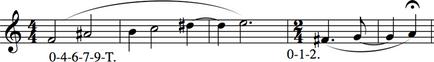 Ejemplo 3: se muestran identidades de cuatro series de notas, pero también se pueden hacen díadas, tricordes, hexacordos, hasta llegar a la serie completa de doce notas 0 2 5 6 8 E(hexacordo), 0 9 8(tricorde), etc
