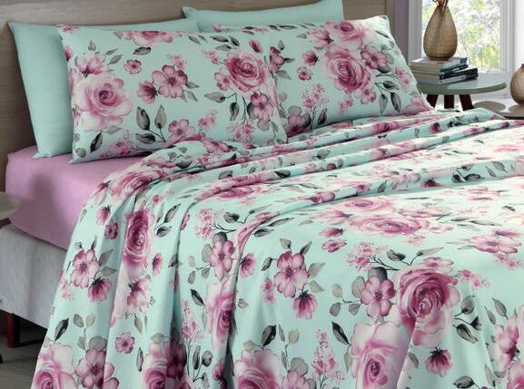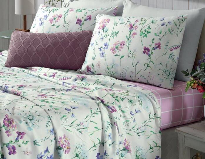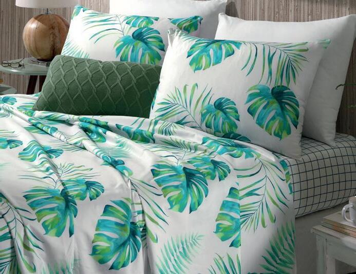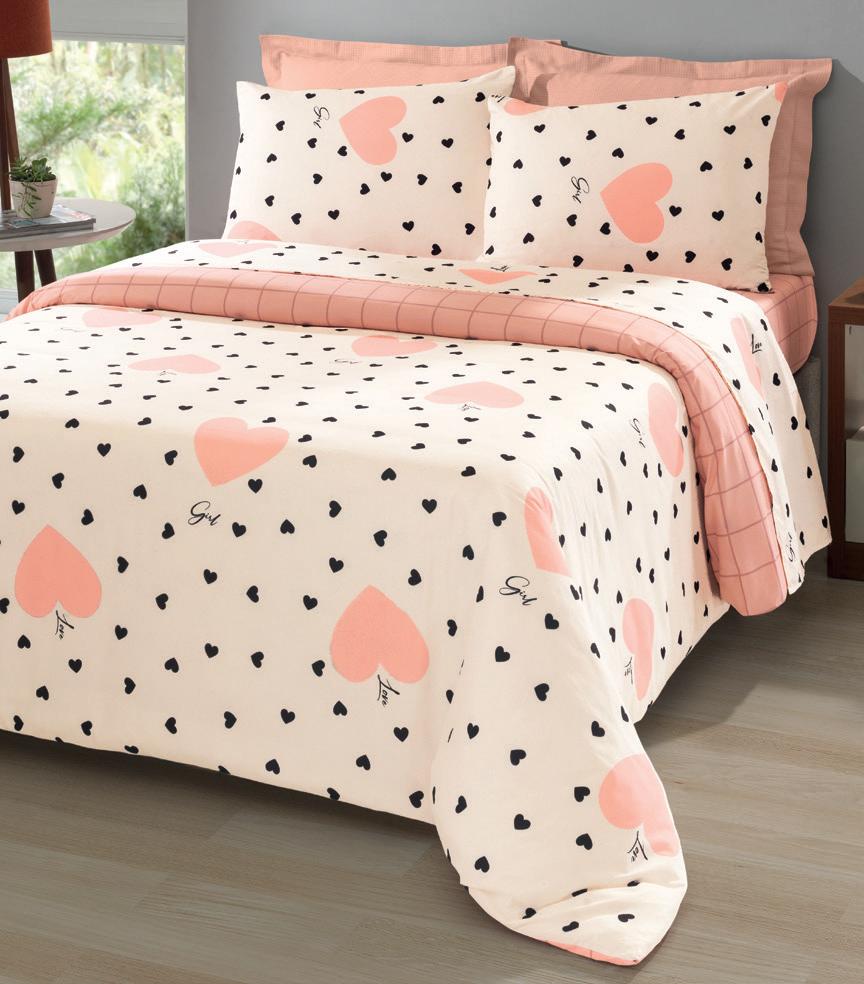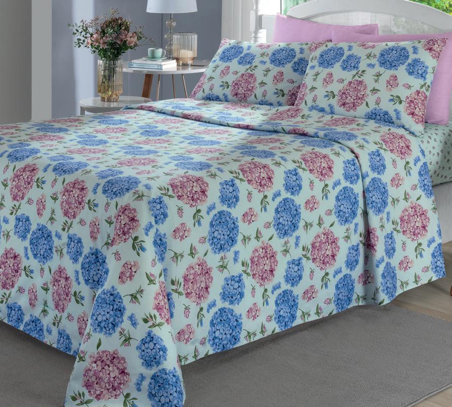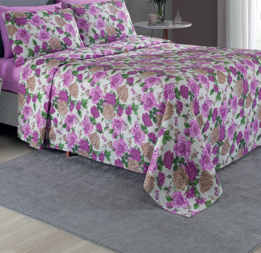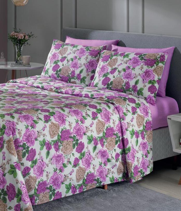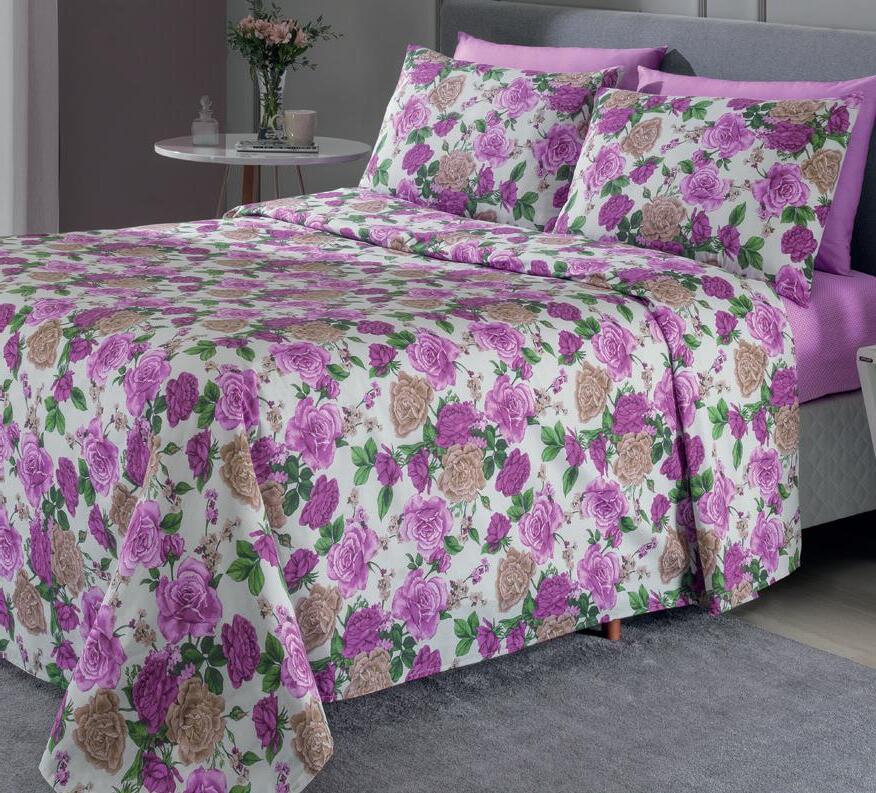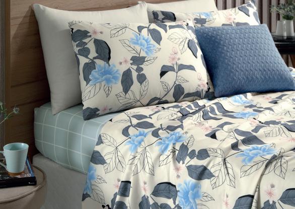 Com 1 sobre lençol estampado (250x280 cm), 1 lençol liso com elástico (193x198x38 cm) e 2 fronhas estampadas (50x70 cm cada). Cód.: 6.228.352