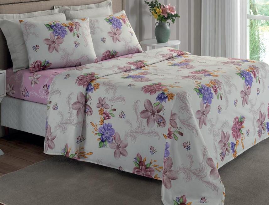 4. Jogo de Cama Casal. Com 1 sobre lençol estampado (220x250 cm), 1 lençol liso com elástico (138x188x30 cm) e 2 fronhas estampadas (50x70 cm cada). Cód.: 6.223.123