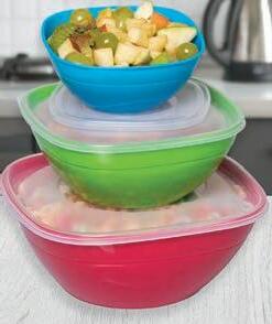 10. Jogo 3 Bowls com Tampa, em bambu ecológico com plástico. Sem opção de cor. Cód.: 6.401.522