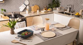 Para la mesa, se destacan opciones para el uso diario, como vasos, cubiertos de metal y madera, y jarra, frascos y azucarera de vidrio con tapa de madera. Pensado para acompañar encuentros y momentos compartidos, se suma un set de tres piezas para picada de cerámica con bandeja. Completan la propuesta fuentes de cerámica aptas para horno en 3 medidas, salero y pimentero de cerámica, tablas para picar, sets de cuchillos para queso y jarras térmicas en tonos pastel. Además, una renovada línea de vajilla de cerámica artesanal confeccionada por Los Naranjos, organización que impulsa el progreso de jóvenes en situación de vulnerabilidad social a partir de la enseñanza del oficio de la cerámica.