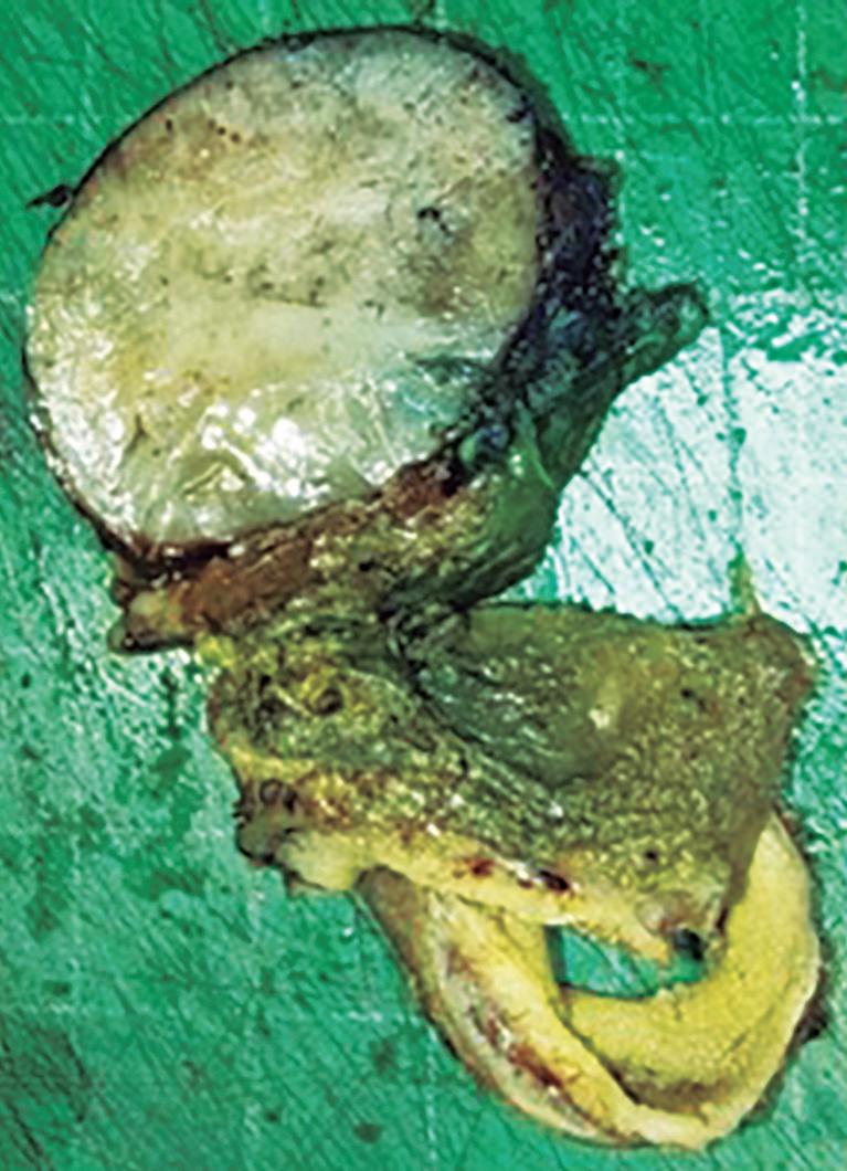 Figure 3. Surgical specimen: Nodular lesion with a greyish colour, well-defined margins, measuring 3.2 x 3 cm