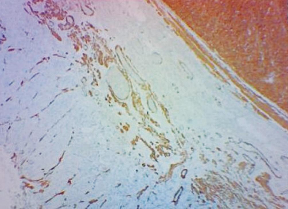 Se realizó la resección laparoscópica de ambos tumores. El análisis histológico reveló proliferaciones de células fusiformes bien delimitadas, sin atipia citológica ni actividad mitótica. La inmunohistoquímica mostró que la lesión subcardial fue positiva en actina de músculo liso (SMA; Figura 4 A) y negativa en CD117, DOG1 y CD34, hallazgos compatibles con leiomioma. En contraste, la lesión localizada en el cuerpo gástrico fue positiva en CD117, DOG1 (Figura 4 B) y CD34, y negativa en SMA y desmina, lo que permitió establecer el diagnóstico de tumor del estroma gastrointestinal (GIST).