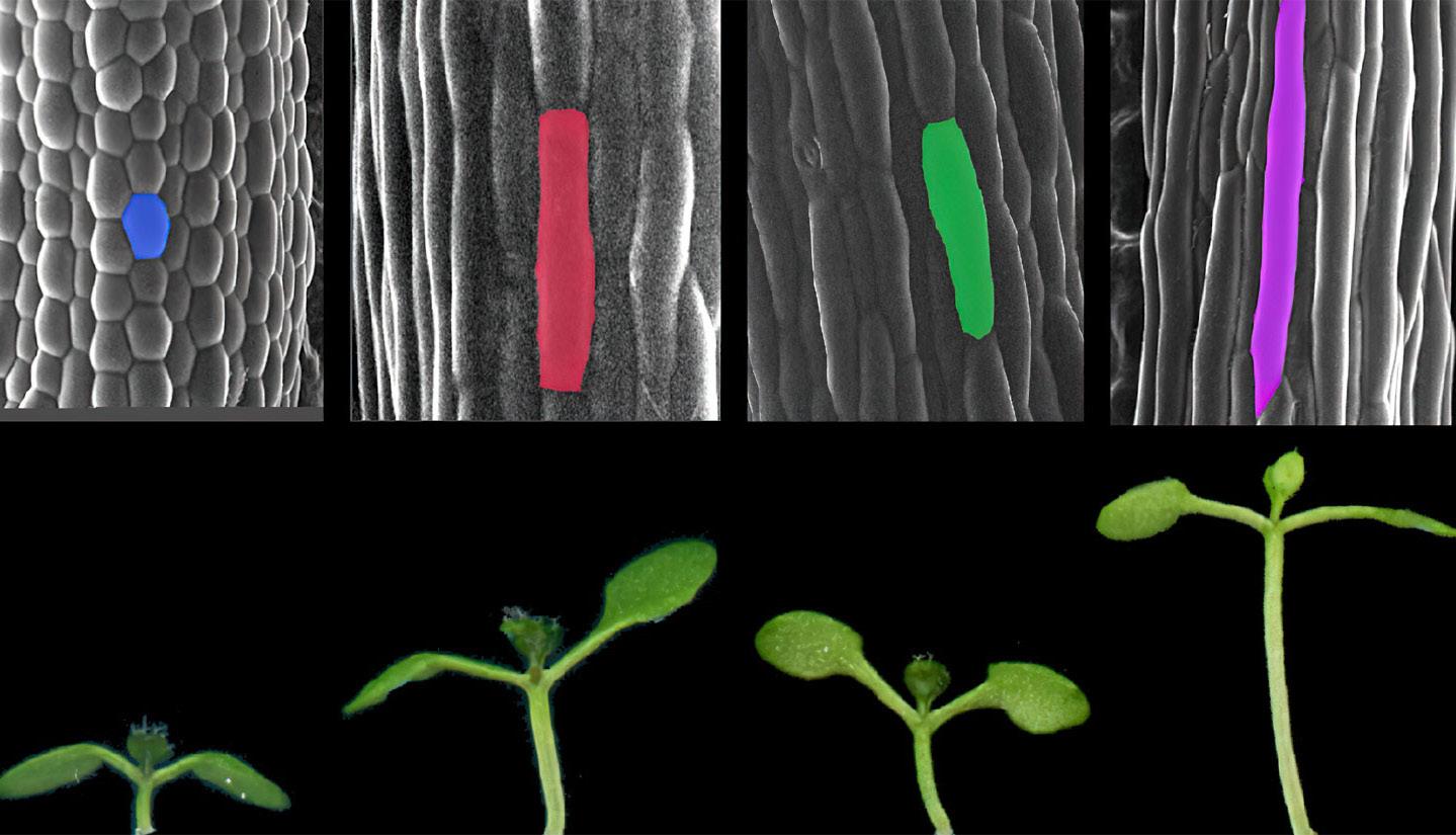 As descobertas ajudarão os cientistas a prever como as plantas responderão às mudanças climáticas – e aumentarão a produtividade das culturas, apesar do aumento da temperatura global que prejudica o rendimento. Células de Arabidopsis thaliana (acima) e plântulas (abaixo) em diferentes condições de luz e temperatura; as mudas retratadas na extrema direita mostram crescimento acelerado em resposta à sombra e temperaturas quentes