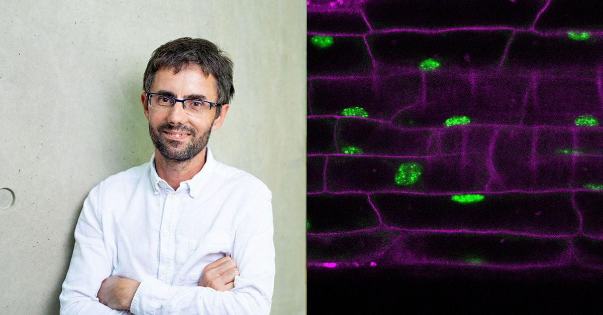 Philip Wigge (esquerda) e (direita) células vegetais são visualizadas contendo proteínas sensoras de temperatura (em verde). As células estão em temperatura mais alta e as proteínas fazem manchas em resposta à temperatura. Isso introduz mudanças na expressão gênica na planta, permitindo que ela se adapte ao calor