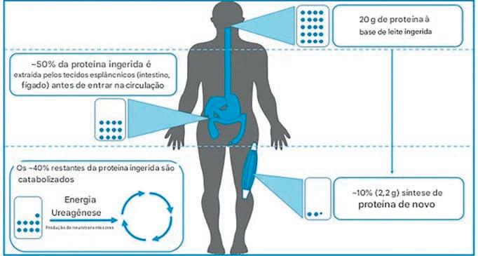 Utilização da proteína em todo o corpo. Da proteína ingerida, aproximadamente 50% é extraída pelos tecidos esplâncnicos antes de entrar na circulação periférica. Apenas cerca de 10% da proteína ingerida é utilizada para a síntese de proteína muscular esquelética, enquanto o restante é catabolizado