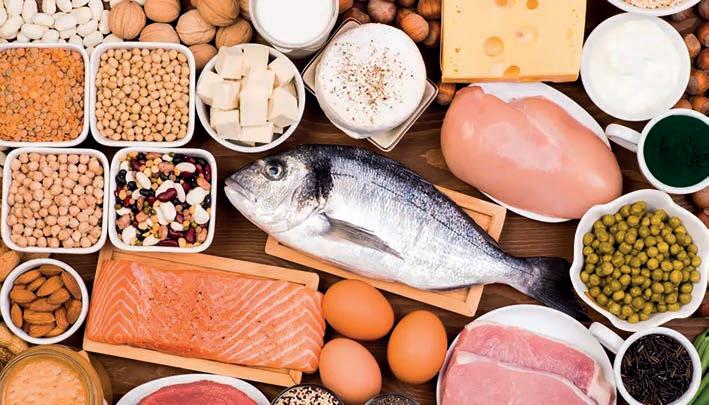 Carne, peixe e ovos, além de tofu, feijão e nozes, são Alimentos ricos em proteínas. Essas proteínas desses alimentos são decompostas pelo nosso organismo em seus componentes — aminoácidos — que as células utilizam para produzir as proteínas de que precisamos. Embora o corpo consiga produzir alguns amino -