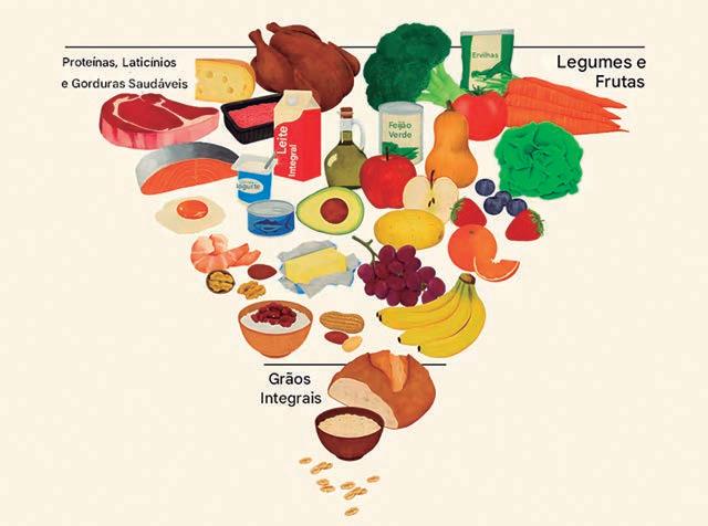 A Nova Pirâmide substituirá o MyPlate como guia visual para as orientações nutricionais do governo federal para os americanos. A nova pirâmide alimentar invertida dos Estados Unidos, reorganiza os grupos de alimentos com base nas diretrizes federais mais recentes. Frutas, vegetais e proteínas estão no topo da pirâmide. Os grãos integrais, como pães e cereais, têm ingestão limitada e aparecem na base. Os grupos de alimentos incluem “Proteínas, Laticínios e Gorduras Saudáveis”, “Vegetais e Frutas” e “Grãos Integrais”. Exemplos visuais de alimentos específicos são fornecidos em cada categoria.