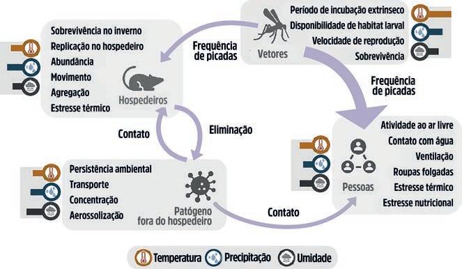 As caixas cinzas listam exemplos de fatores intrínsecos sensíveis ao clima. As setas indicam processos-chave de transmissão que podem ser sensíveis ao clima; a largura da seta ilustra a evidência relativa do impacto no risco da doença. Os pequenos gráficos de barras mostram as ponderações hipotéticas da temperatura, precipitação e umidade para cada componente. Essas vias e ponderações são indicativas, não exaustivas, e variam de acordo com o patógeno, o local e a estação do ano.