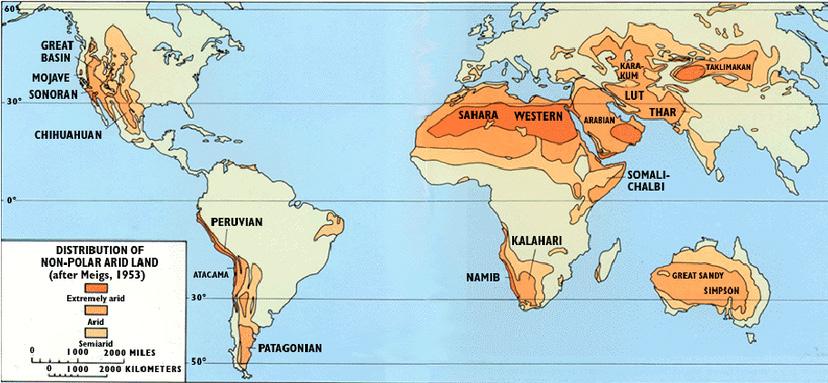 Distribuição espacial das regiões áridas e semi-áridas da terra (Sombreado)