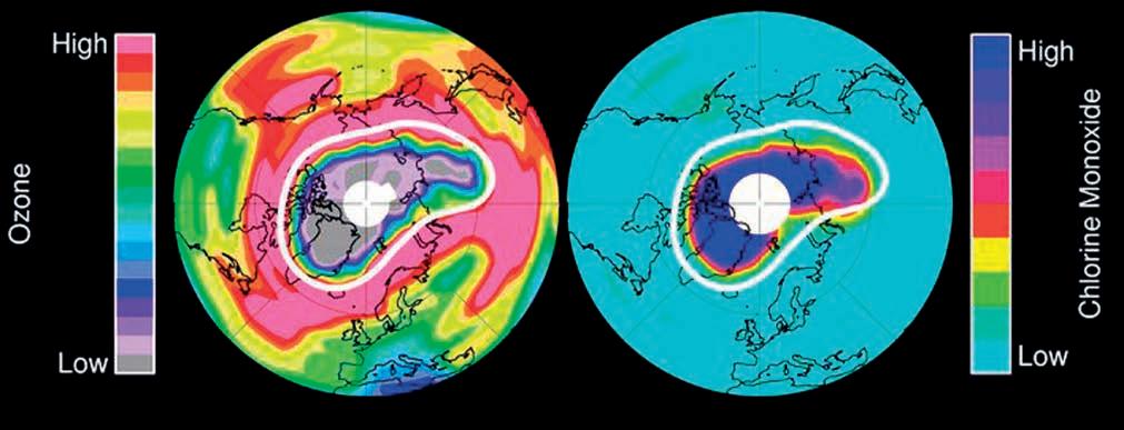 Esquerda: Ozônio na estratosfera da Terra a uma altitude de aproximadamente 12 milhas (20 quilômetros) em meados de março de 2011, próximo ao pico da perda de ozônio no Ártico em 2011. As cores vermelhas representam altos níveis de ozônio, enquanto as cores roxa e cinza (sobre a região polar norte) representam quantidades muito pequenas de ozônio. Direita: monóxido de cloro – o principal agente da destruição química do ozônio na baixa estratosfera polar fria – para o mesmo dia e altitude. As cores azul claro e verde representam pequenas quantidades de monóxido de cloro, enquanto as cores azul escuro e preto representam quantidades muito grandes de monóxido de cloro. A linha branca marca a área dentro da qual ocorreu a destruição química do ozônio
