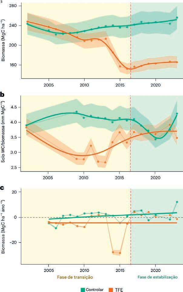 uma diminuição de ~15,8 mm estação seca −1 (74,5%) e as mudanças climáticas globais levando a uma diminuição de ~5,2 mm estação seca −1 (25,5%). No geral, essas descobertas destacam a intrincada relação entre o desmatamento e as mudanças climáticas globais na influência dos padrões de precipitação na Amazônia. Além disso, os resultados deste estudo sugerem que a Amazônia está passando por uma transição crítica, potencialmente exacerbada por eventos extremos, como a seca sem precedentes de 2023. No entanto, permanecemos cautelosos quanto à definição de um limite preciso de desmatamento que poderia desencadear o declínio em escala de bioma, particularmente porque nossa extrapolação não leva em conta totalmente as incertezas substanciais inerentes às interações clima-vegetação, que permanecem sujeitas a incertezas significativas. Juntos, o desmatamento e as mudanças climáticas estão impulsionando transformações substanciais em toda a região durante a estação seca, resultando em redução de chuvas, temperaturas elevadas e aumento dos níveis atmosféricos de GEE. Essas descobertas ressaltam a importância de manter e restaurar a cobertura florestal na Amazônia como uma estratégia crucial para mitigar as mudanças climáticas e garantir a estabilidade dos ecossistemas.