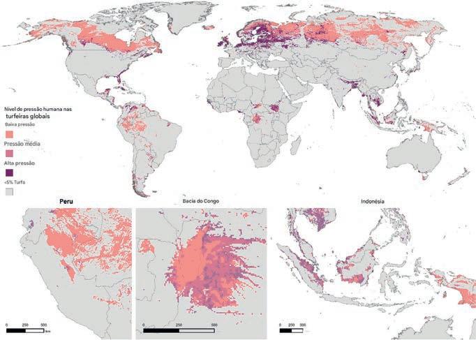 Pressão humana em turfeiras globais, visualizada aqui usando um limite de fração de turfa de 5% no mapa Peat-ML. Pressão humana medida usando o Índice de Impacto Humano, discretizado em categorias baixa (< 400), média (400–700) e alta (> 700).