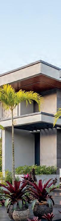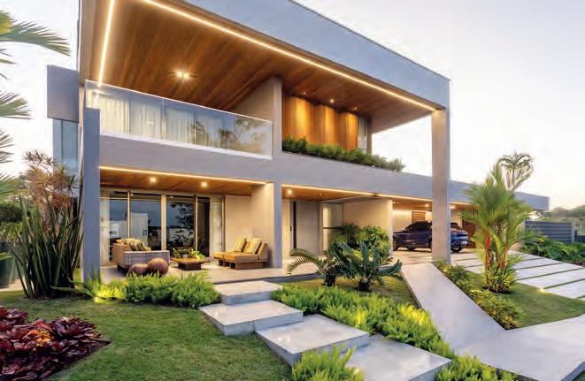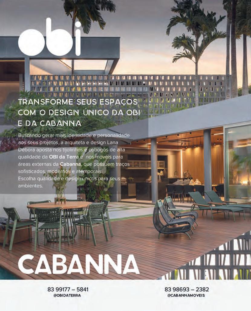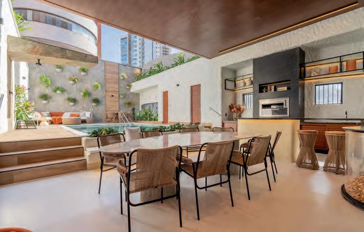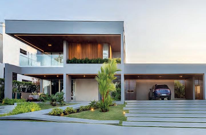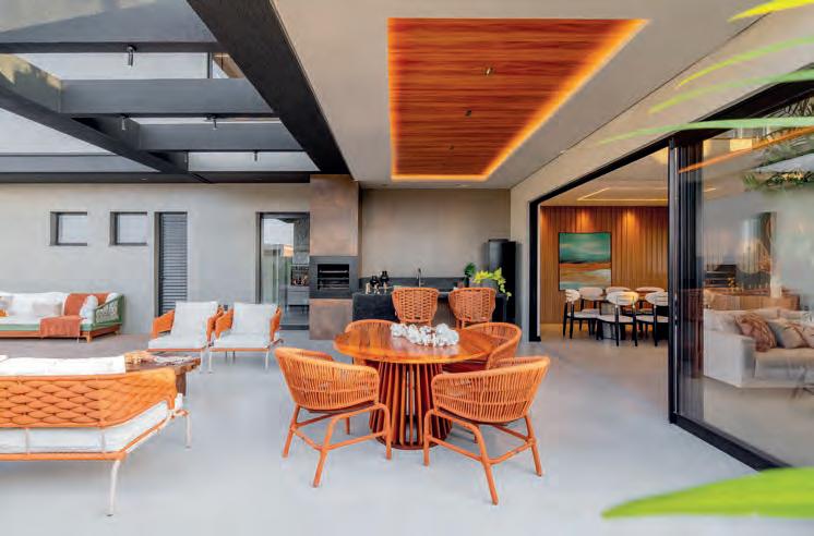 Ideias do projeto. Esta residência, assinada pelas arquitetas Lana Débora e Bibi Cruz, reflete uma estética sofisticada e contemporânea, caracterizada por linhas puras e uma paleta de cores que combina tons de cinza ao uso da madeira em meio a um paisagismo exuberante, conferindo ao design uma elegância atemporal. A escolha de esquadrias de vidro do piso ao teto, que podem ser totalmente abertas, foi fundamental para dissolver as barreiras entre a casa e a natureza ao redor, proporcionando uma fluidez visual e física entre os espaços internos e externos e resultando em um ambiente que valoriza a conexão e o bem-estar. Um dos pontos alto do projeto é a varanda gourmet, um espaço de convivência multifuncional que incorpora churrasqueira, uma grande ilha para preparo de alimentos, mesas para refeições, área de jogos e TV, móveis outdoor desenhados pelo escritório, além de integração com a piscina e o ofurô, tornando-se o ponto de encontro perfeito para momentos de descontração com familiares e amigos. Detalhes marcantes. Uma peça-chave do projeto é o cobogó IPÊ, um elemento desenvolvido pelo próprio escritório, com um design linear, moderno e leve, que acrescenta uma permeabilidade visual e permite a entrada de luz e ventilação naturais, criando um efeito dinâmico na fachada e nos interiores. Outra peça autoral desenvolvida por Lana Débora é a cadeira Jacumã, que além dos traços originais, agrega conforto e beleza à área da piscina.