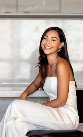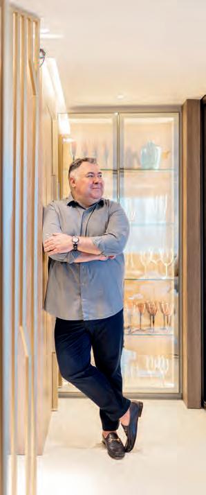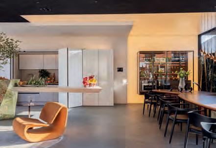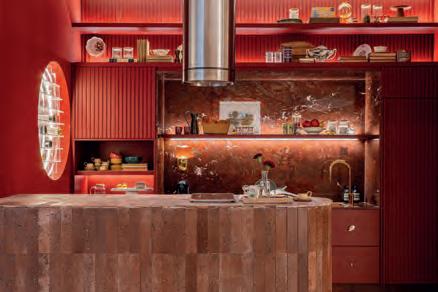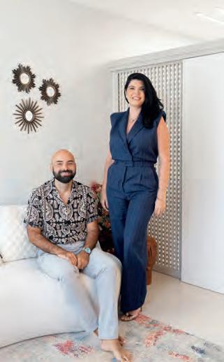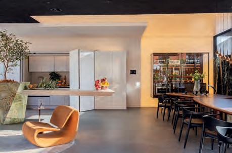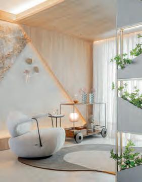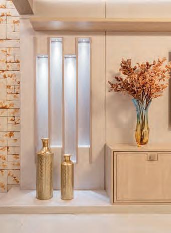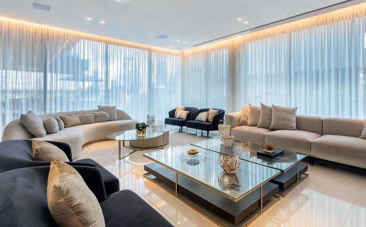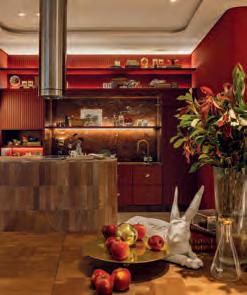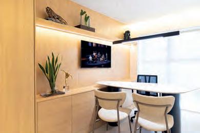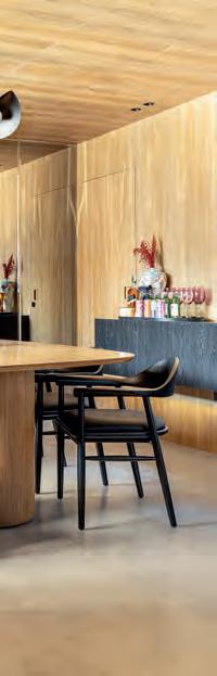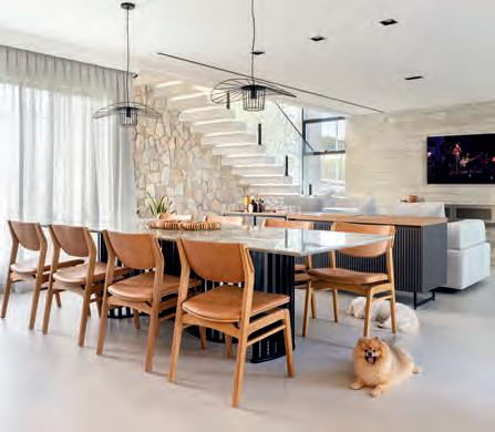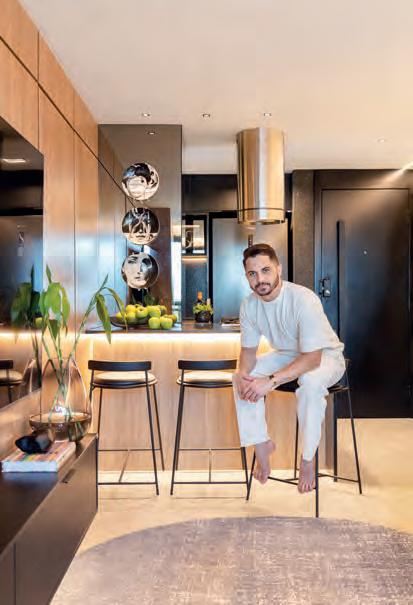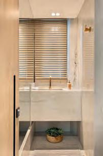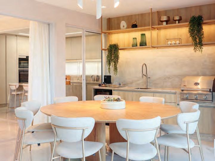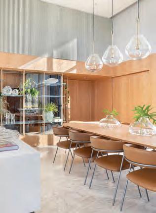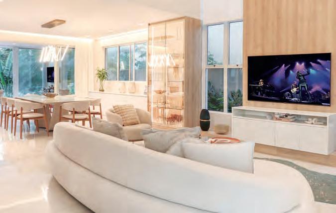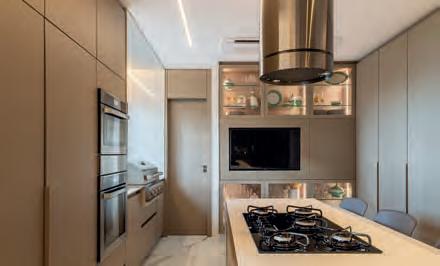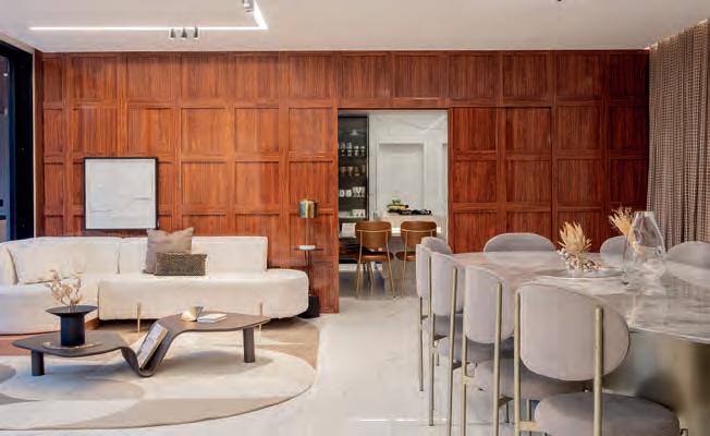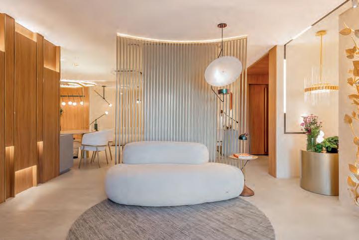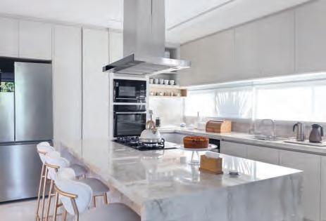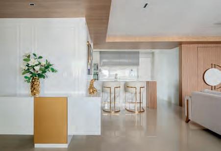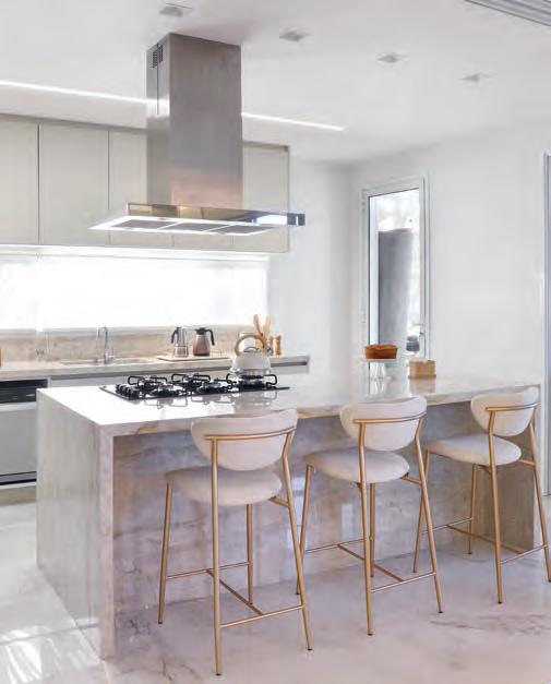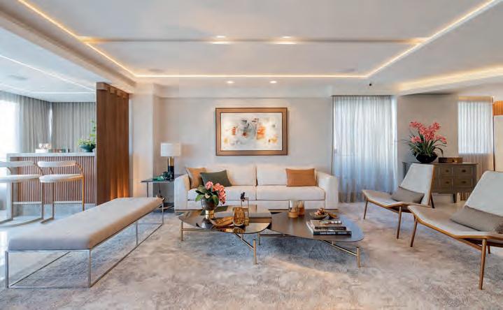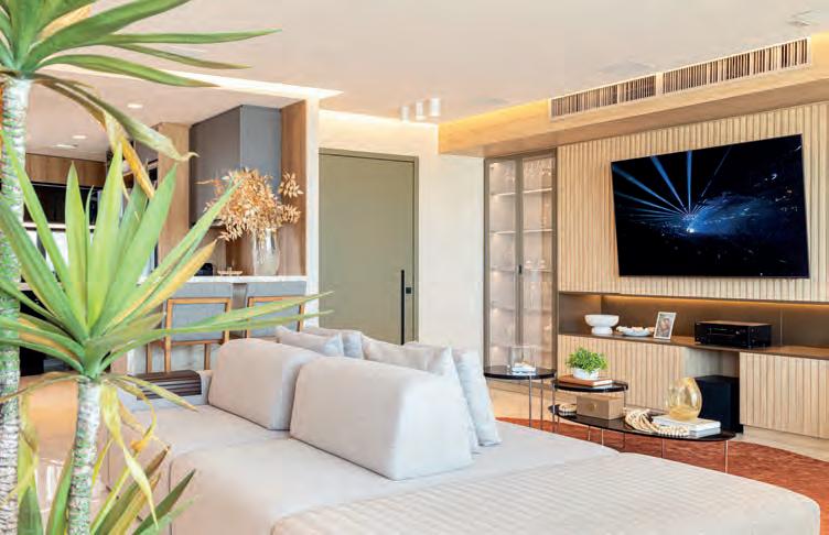 Ideias do projeto. A integração fluida da área social da residência, contemplando hall, sala, varanda, cozinha e ainda um home office, foi o ponto de partida do projeto assinado por Cristina Maia. “Com foco na funcionalidade e no luxo discreto, o apartamento foi pensado para otimizar a convivência entre os moradores em um ambiente harmônico e contínuo”, afirma. O mobiliário contemporâneo de caráter convidativo e os materiais elegantes dão o tom da ambientação, conferindo unidade visual aos espaços. A cartela de cores dominada por tons claros, garante a sensação de leveza e amplitude, enquanto toques de dourado agregam requinte e atemporalidade. Tudo é devidamente realçado pelo luminotécnico de essência intimista e discreta, ideal para destacar as texturas e os principais elementos da composição. Detalhes marcantes. O uso do elemento em pedra natural no puxador da porta de entrada trouxe sofisticação e serviu ainda como cartão de visitas do projeto. Na cozinha aberta, a bancada em pedra seguindo a mesma curvatura do painel ripado é um exemplo singular do equilíbrio entre funcionalidade e estética.