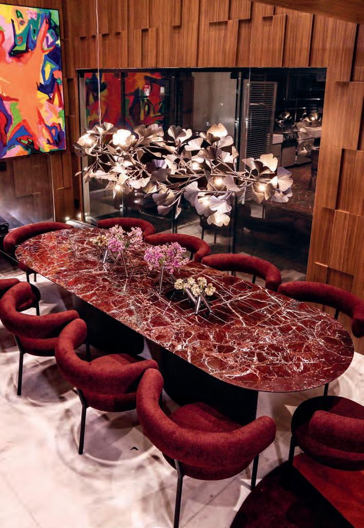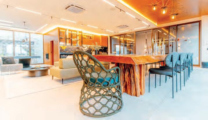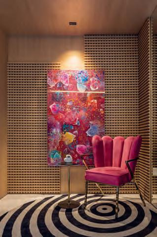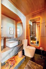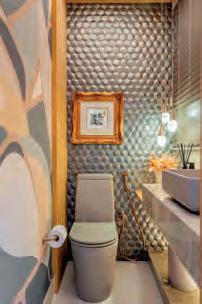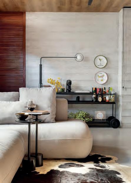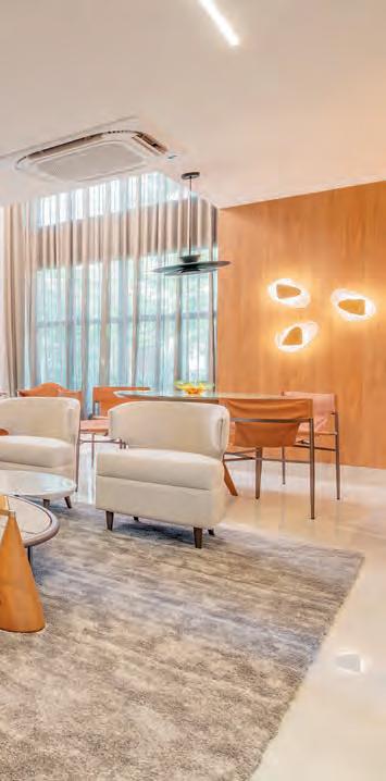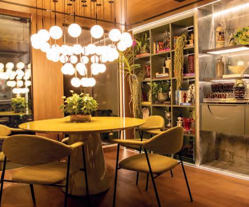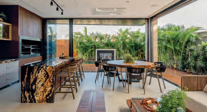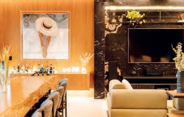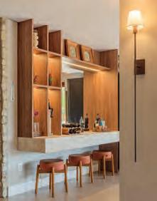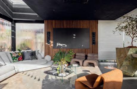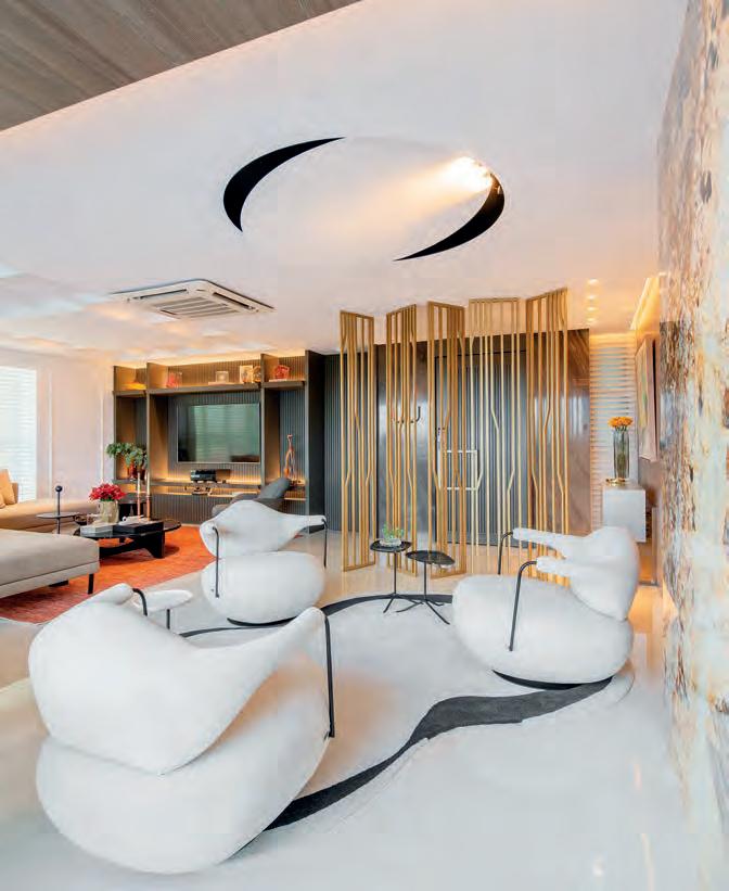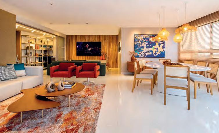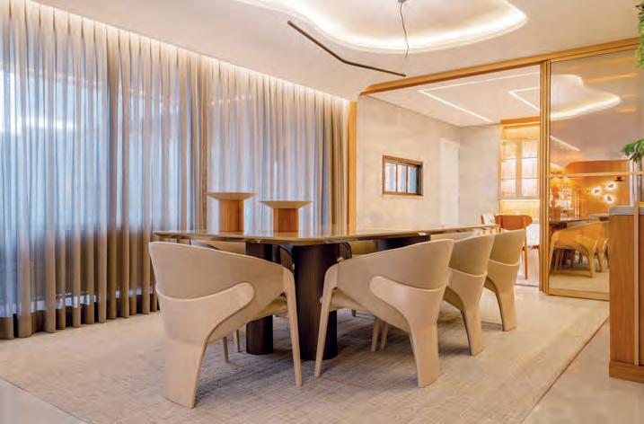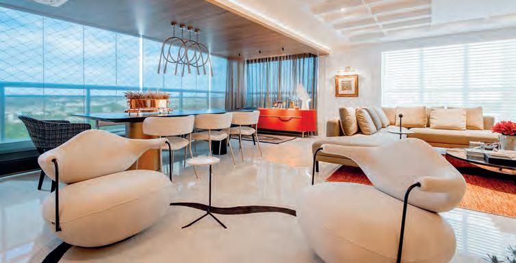 Ideias do projeto. Neste amplo apartamento, não falta espaço para receber e para explorar o melhor do design contemporâneo, graças ao olhar apurado de André Monte. Com liberdade e técnica, o designer desenvolveu este projeto de ar conceitual e estilo “open space”, que não abre mão da funcionalidade e do máximo conforto em todas as suas dimensões. Os materiais, as formas e as cores são utilizados com maestria, com um apelo sensorial e estético que fazem parte do lifestyle do cliente. O impacto visual é garantido logo na entrada pelos brises geométricos em dourado fosco, pelo conjunto arrojado de poltronas Dunna, desenhadas por Maurício Bomfim, e pela iluminação que desafia a geometria do forro. Madeira ebanisada e pedras nobres também são destaque, aplicadas, por exemplo, no painel do estar e no frontão da cozinha, trabalhada em uma paleta sóbria e moderna. Afinal, sentir-se em casa em meio a tantas peças de arte e design define uma personalidade única. Detalhes marcantes. A varanda integrada à sala recebeu a mesa de jantar e buffet de apoio em tom vibrante. Já a churrasqueira foi para um espaço mais recuado, deixando o mobiliário da sala de jantar sobressair. O forro de gesso tipo colmeia é outro elemento moderno, presente tanto no living e quanto no lavabo.