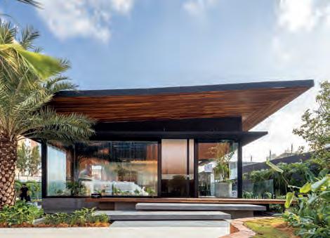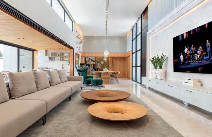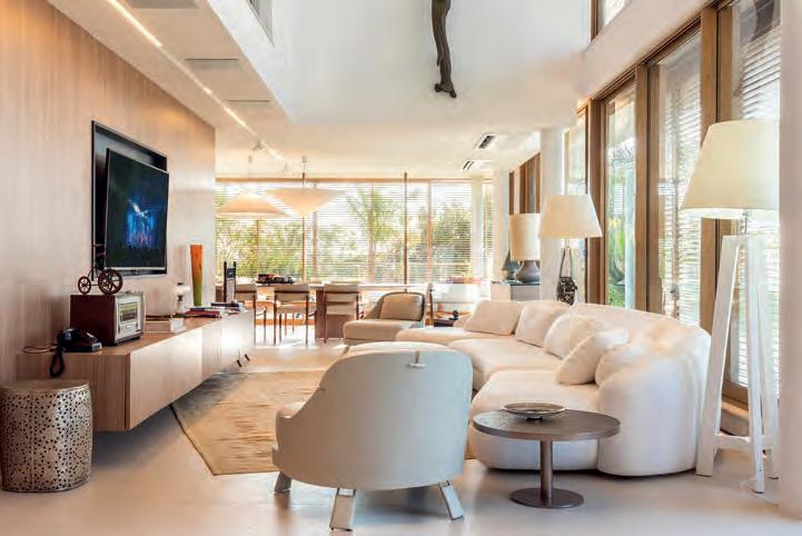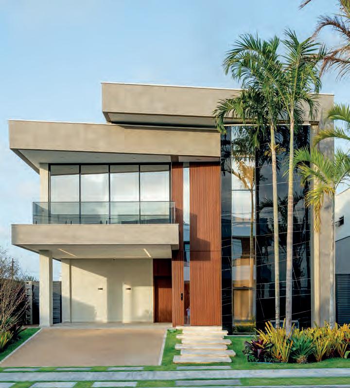 Ideias do projeto. As particularidades do terreno, com um dos lados voltados a um encantador lago, nortearam a proposta desta casa assinada pela arquiteta Samara Gosson. A presença de duas esquinas, com dois lados voltados para a rua e um lado para o lago, guiou a concepção de três fachadas “frontais”, permitindo que a casa estivesse totalmente integrada a paisagem do entorno. Se na fachada principal, tons neutros, os vidros reflectas e as linhas retas ganharam destaque, na face lateral brises em madeira e os tradicionais cobogós ajudam a estabelecer uma conexão com os jardins. No térreo, a planta foi projetada de forma que todos os espaços comuns tivessem uma vista privilegiada, culminando em um deck com spa aberto para a área verde ao redor do lago. No pavimento superior, o destaque é o quarto com vista para o lago, proporcionando uma experiência de contemplação da natureza. Nos interiores, a sobriedade da paleta de cores e o mobiliário solto de desenho sinuoso evocam uma atmosfera clean e acolhedora, criando um verdadeiro refúgio para se desconectar e se sentir mais perto da natureza. Detalhes marcantes. A varanda, acessada pela circulação dos quartos, complementa a conexão com o exterior, valorizando a paisagem e trazendo o verde para dentro do cotidiano da casa. A cozinha, em madeira in natura, de linhas minimalistas e elementos em aço, com bancada em pedra natural, assume uma pegada levemente industrial.