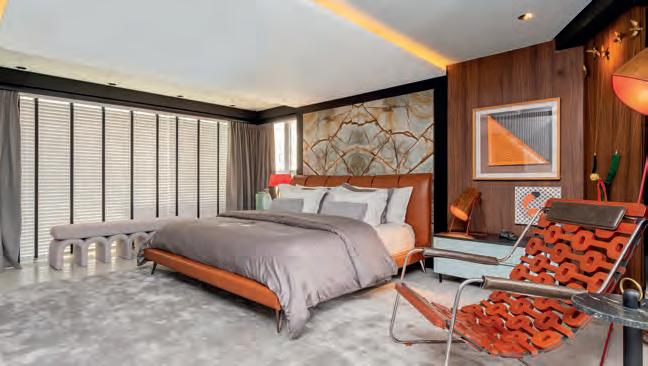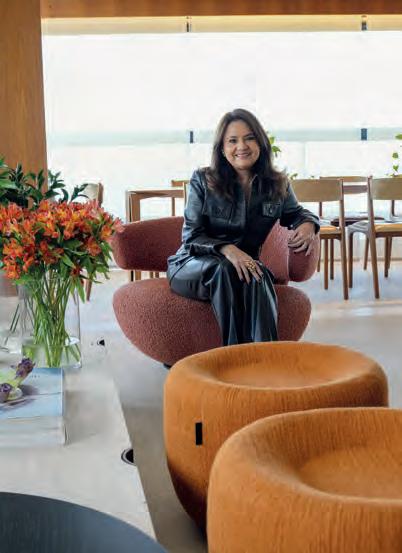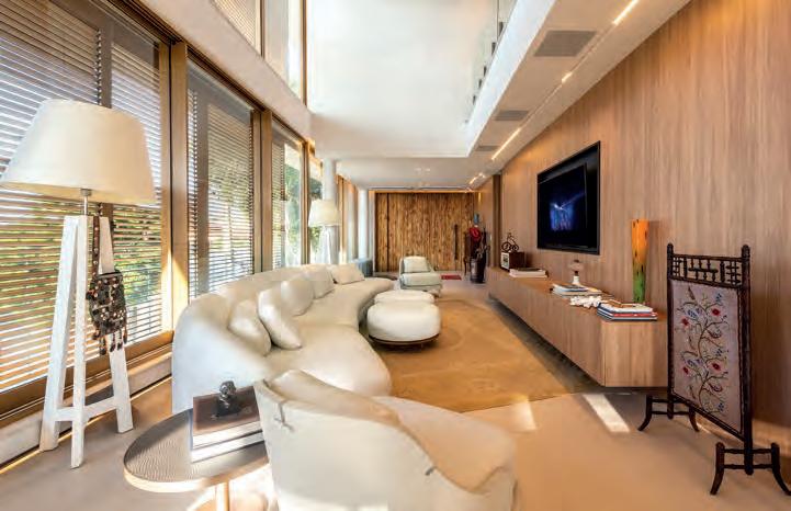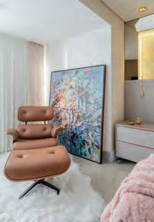 Ideias do projeto. Após retornarem de uma temporada morando na França, os clientes sentiram necessidade de reformar a residência triplex, transformando-a em um espaço que combinasse o charme sofisticado europeu com o aconchego brasileiro. Assim, o retrofit assinado por Gabi Picanço priorizou a harmonia de ícones de design nacional e peças do acervo dos clientes, criando ambientes personalizados que representam a memória afetiva. O amplo living, com layout integrado e fluido, tornou-se o coração da casa, onde elementos como os tapetes atuam como pontos de interseção entre os diferentes espaços, criando uma atmosfera única e exclusiva. Detalhes marcantes. A curadoria de peças de design assinado é o ponto alto do décor Criações de nomes como Sérgio Rodrigues, Jader Almeida e Oscar Niemeyer, em especial com o banco Marquesa em destaque no estar e a presença da consagrada poltrona Mole no quarto da filha, exaltam a brasilidade e conferem um toque de autenticidade à residência. A suíte exala classicismo e atemporalidade, incluindo um pequeno estar e uma elegante penteadeira.
