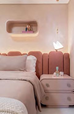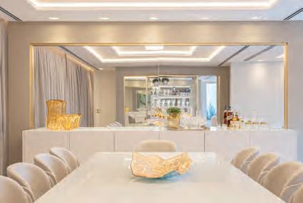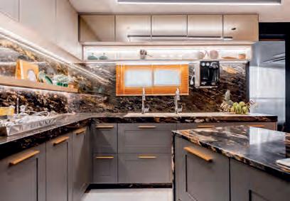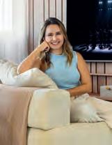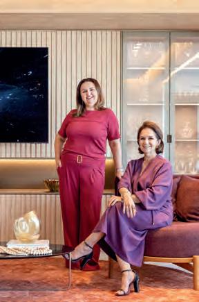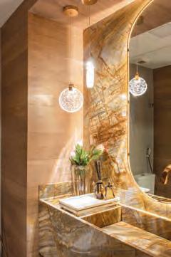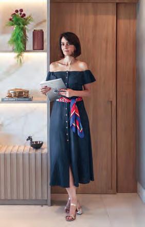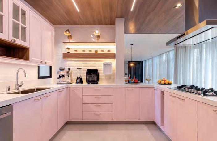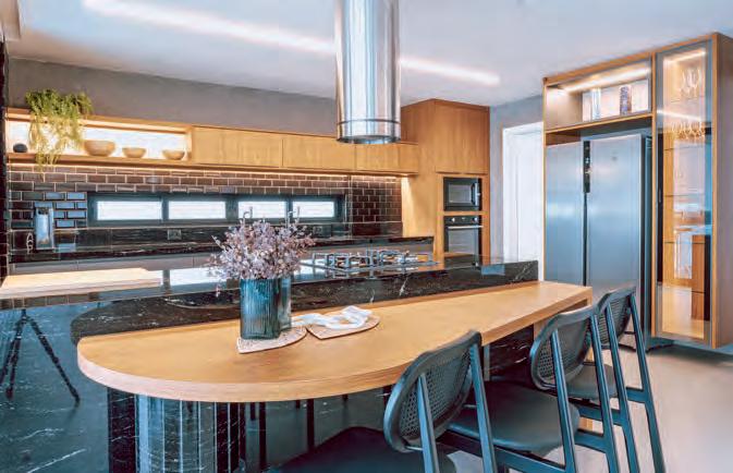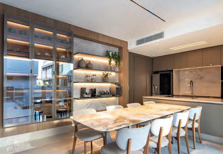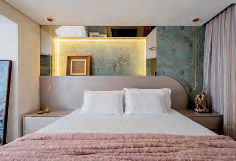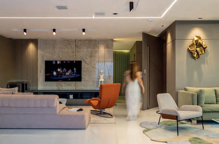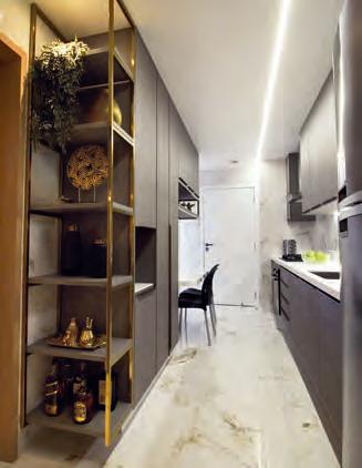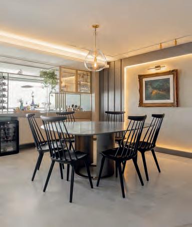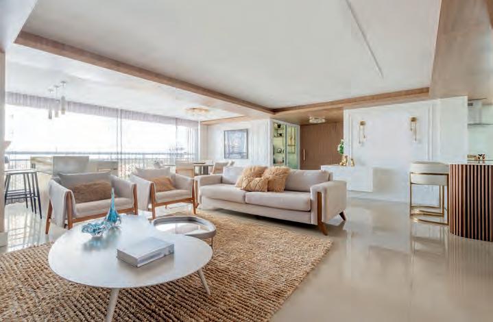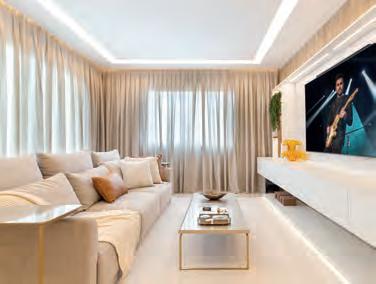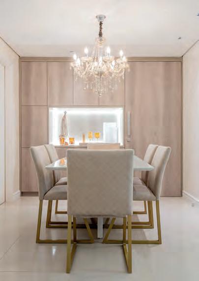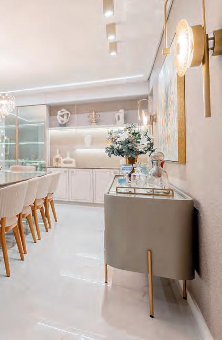 Ideias do projeto. O apartamento de 207 m² projetado para uma família de seis pessoas, teve como ideia central aliar funcionalidade à personalidade e necessidades de todos os moradores. Conceição e Andressa Almeida criaram uma composição marcada pela base neutra, reservando pontos de cor para adornos e obras de arte, além de incorporar toques pontuais de dourado como elemento de integração visual por todo o décor. Painéis amadeirados e o charme das pedras naturais, a exemplo do mármore e ônix, complementam o ambiente, conferindo elegância à morada. A iluminação foi planejada em detalhes para atender às necessidades específicas de cada espaço, alternando entre luminárias sofisticadas e perfis de LED embutidos, tanto na arquitetura e quanto no mobiliário. Detalhes marcantes. Nas suítes, as linhas curvas comandam o desenho dos móveis e testeiras. O lavabo transmite uma atmosfera luxuosa, o espelho que percorre a parede da cuba do piso ao forro proporciona sensação de amplitude ao ambiente. A ampla cozinha em tons de cinza reflete o gosto do cliente pela gastronomia, com bastante espaço para armazenamento e generosas bancadas para o preparo de deliciosas refeições.